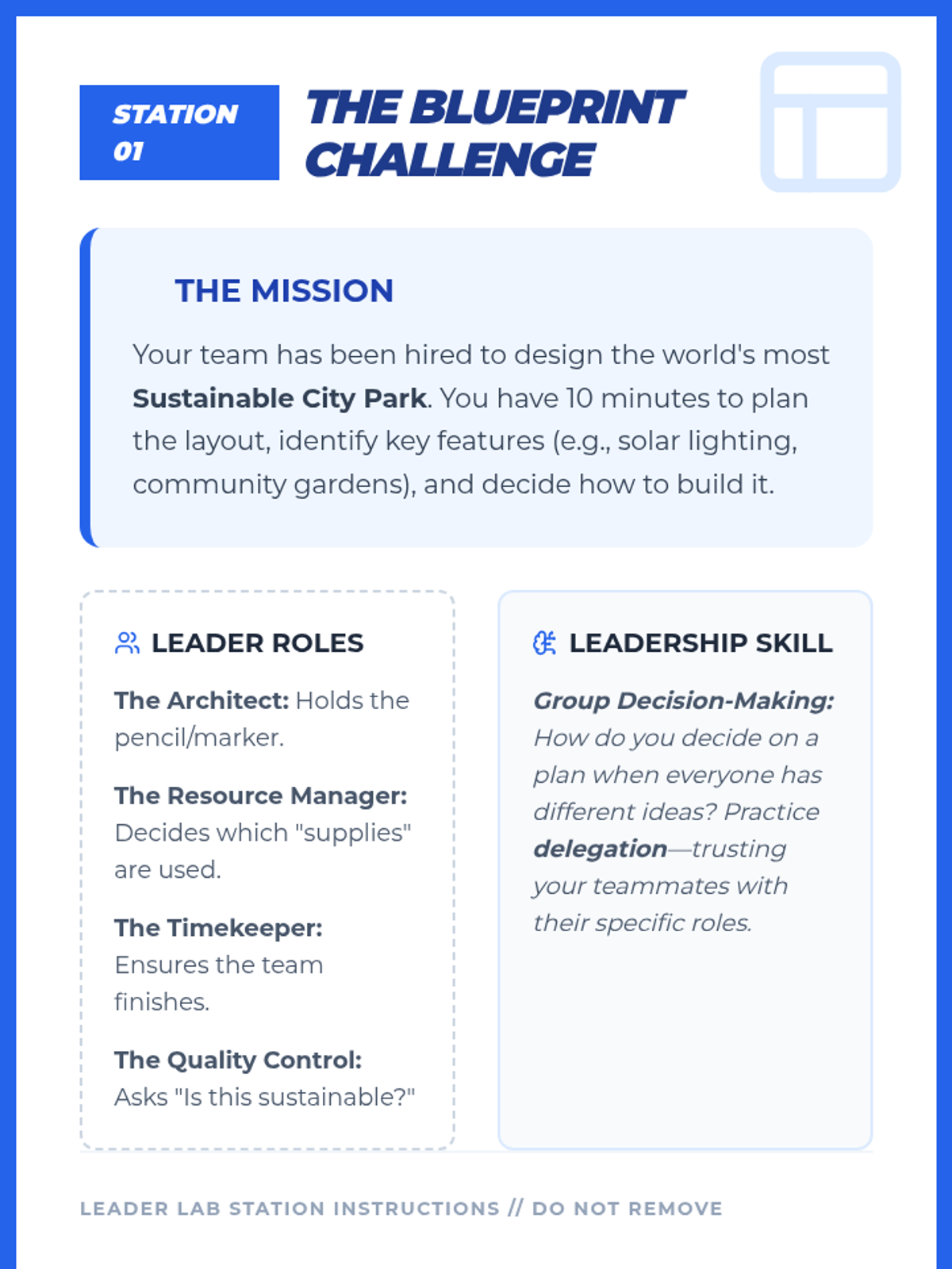 A set of interactive slides to introduce the Leader Lab session, outlining the core skills of leadership and providing clear instructions for three activity stations.