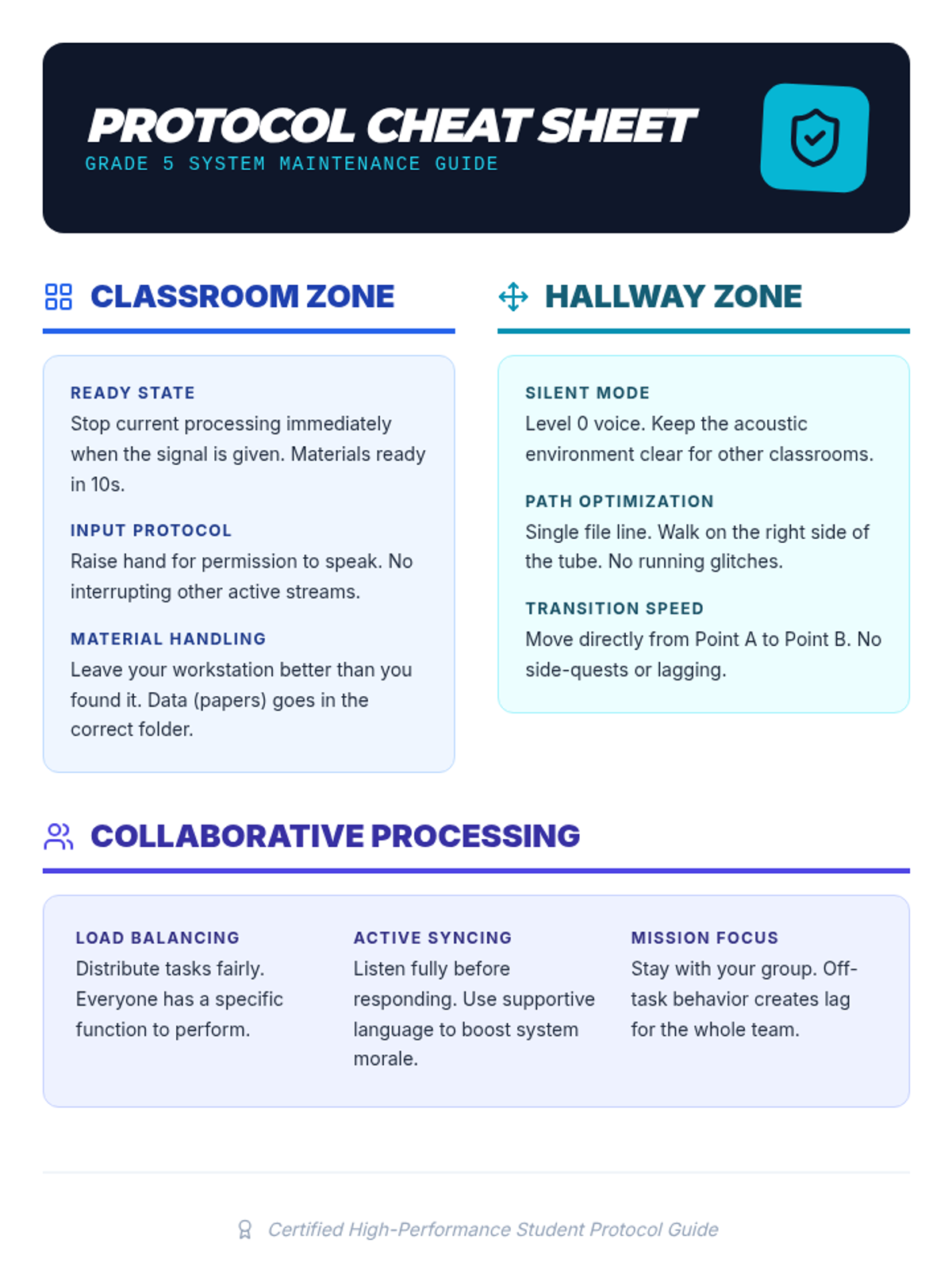 A handy reference sheet for students summarizing the 'Success Code' protocols for classroom, hallway, and group work environments.
