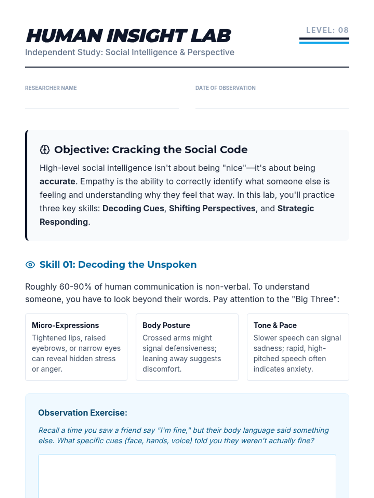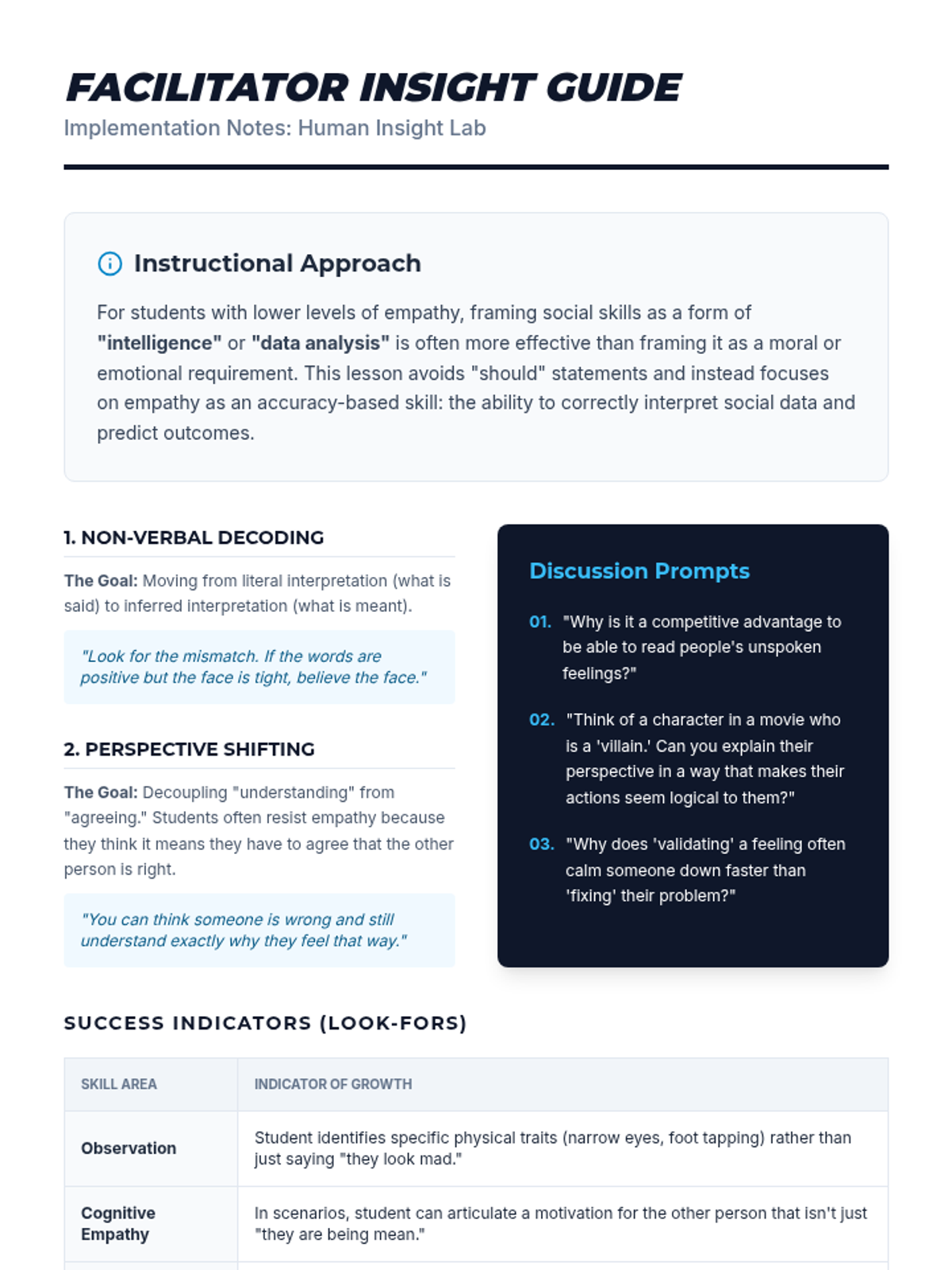 A teacher guide for facilitating the Human Insight Lab. Includes instructional philosophy for teaching empathy to 8th graders, discussion prompts, look-fors in student work, and differentiation strategies.