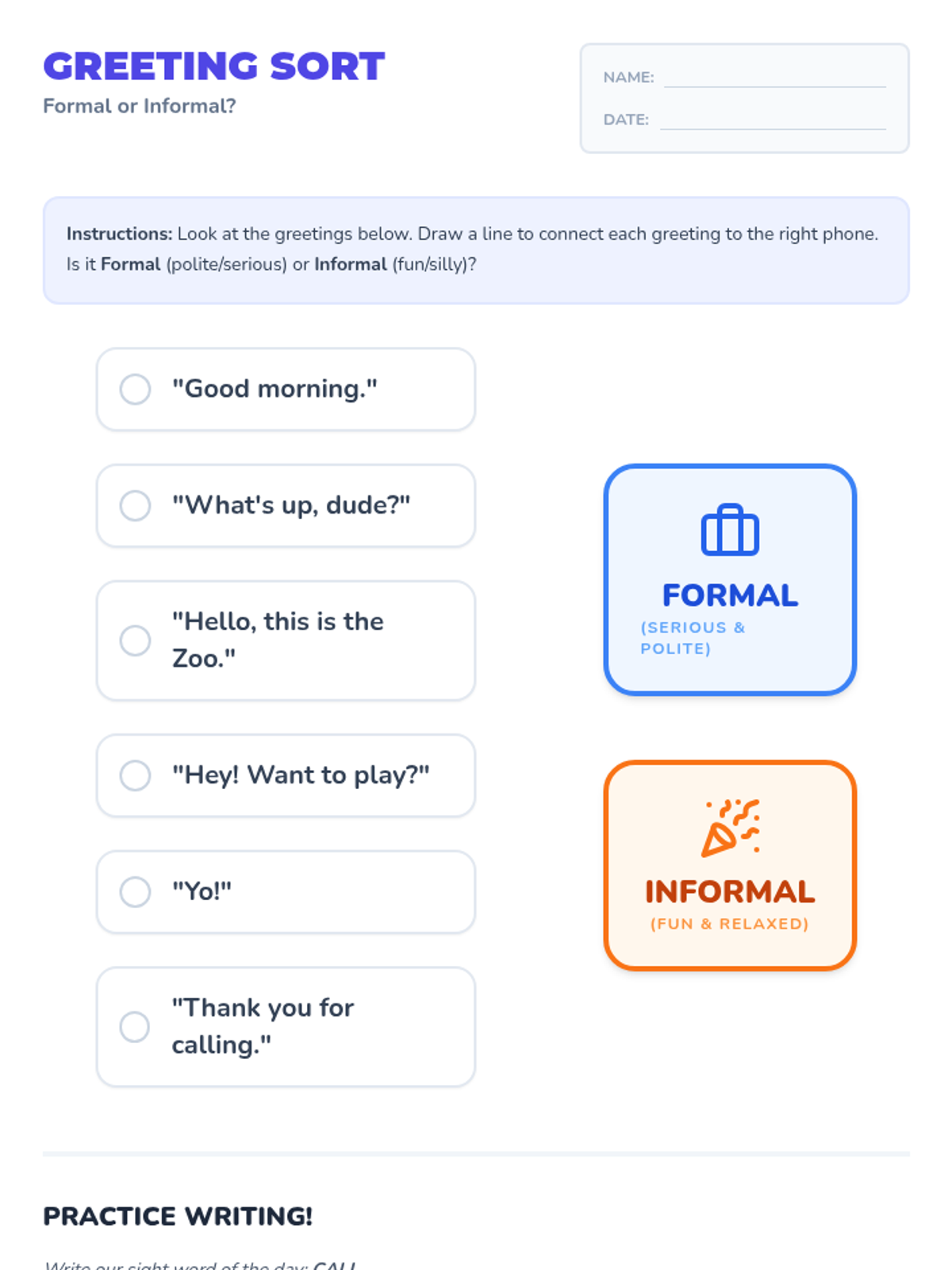 A matching worksheet where 1st grade students connect formal and informal greetings to their respective categories and practice writing the sight word 'CALL'.