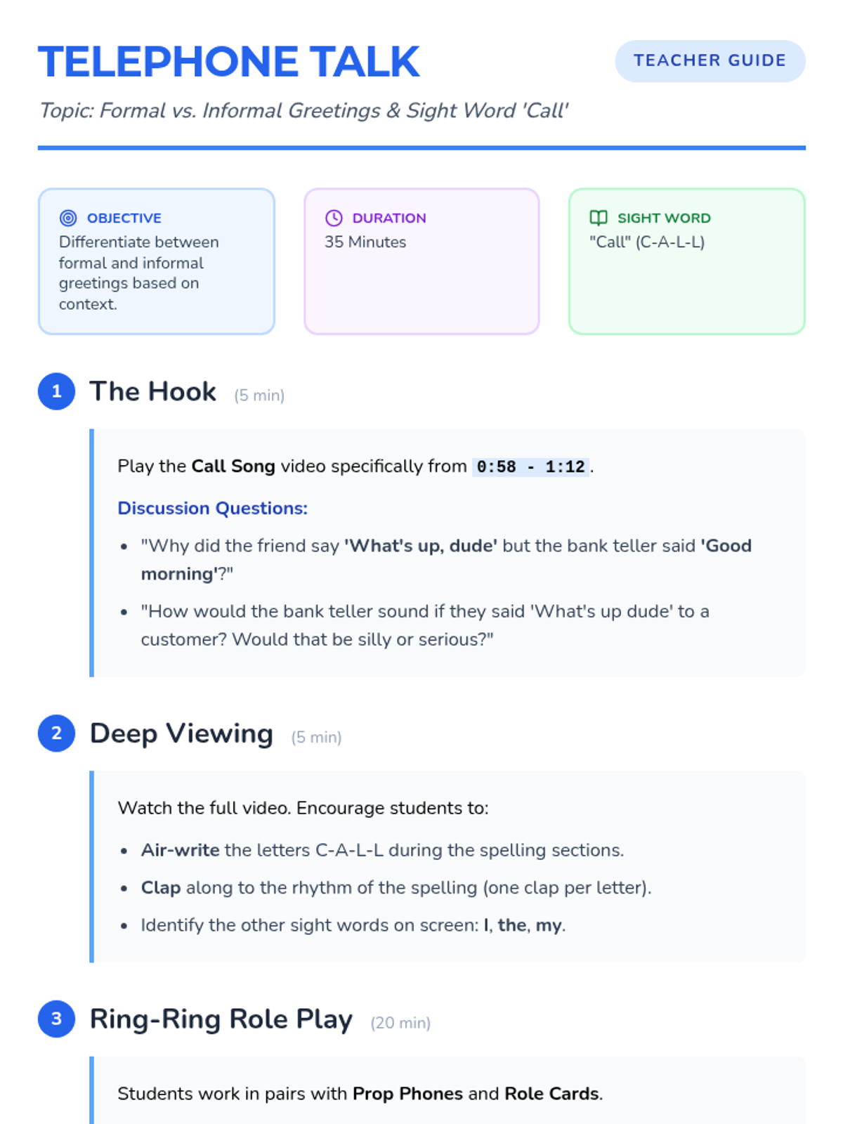 A comprehensive facilitator guide for the Telephone Talk lesson, detailing the instructional flow, discussion questions, and activity management for 1st grade students.