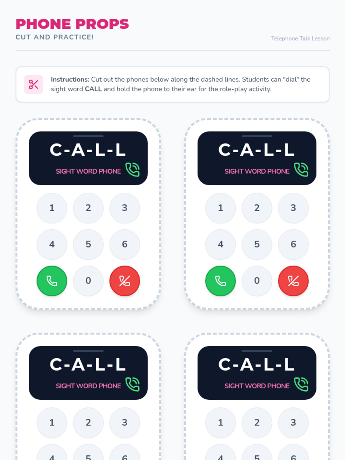 Printable prop phones for 1st grade students to use during role-play activities. Each phone features the sight word 'CALL' on the screen and a realistic (but static) keypad layout.