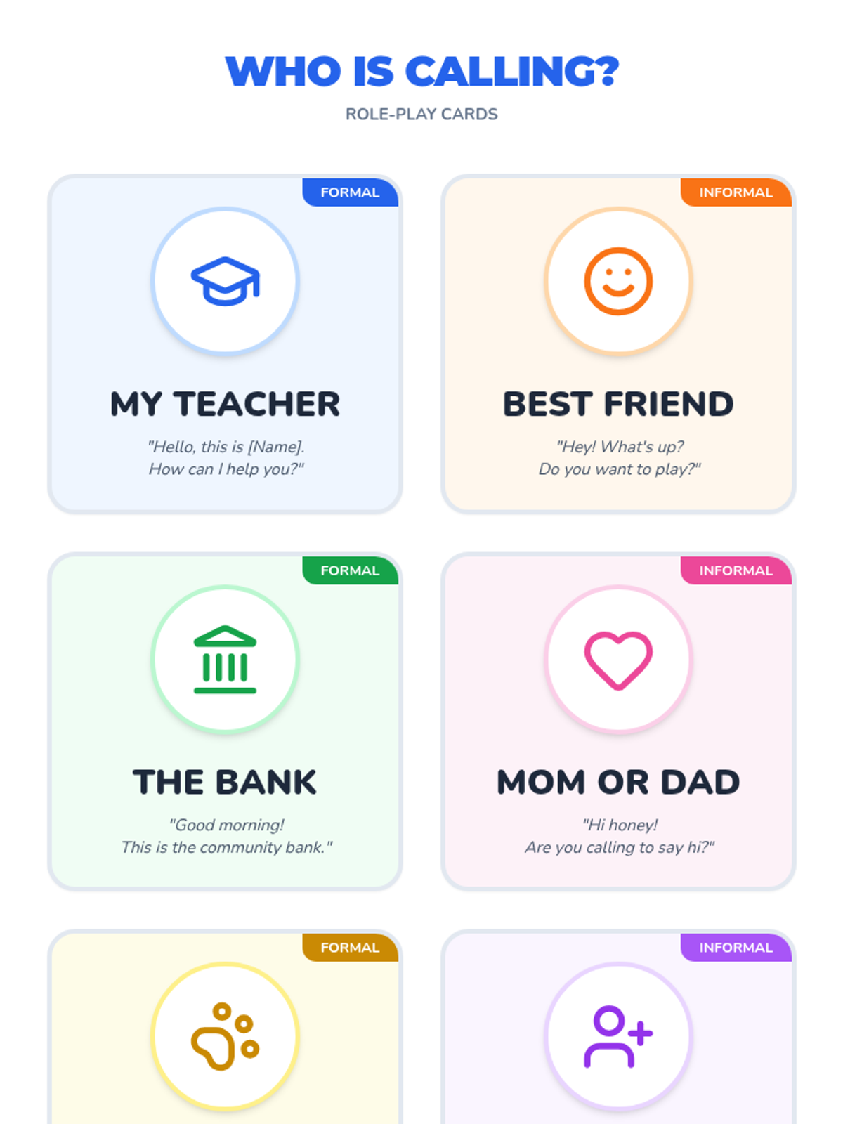 Visual role-play cards for 1st grade students, featuring six different characters/locations (Teacher, Best Friend, Bank, Mom/Dad, Zoo, Cousin) with suggested greetings for formal and informal contexts.