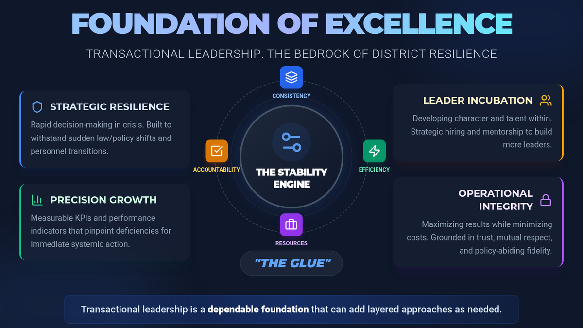 A high-impact slide with a central diagram representing the "Stability Engine" of transactional leadership, highlighting resilience, growth, development, and integrity.