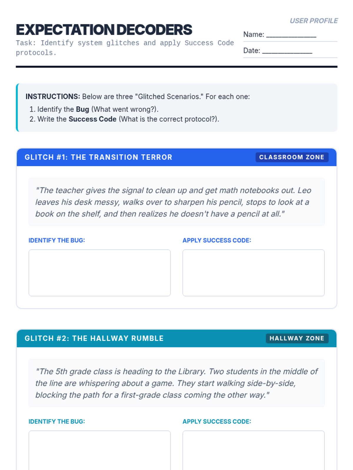 An interactive worksheet where students identify behavioral 'bugs' in common scenarios and write the corresponding 'Success Code' protocols to fix them.