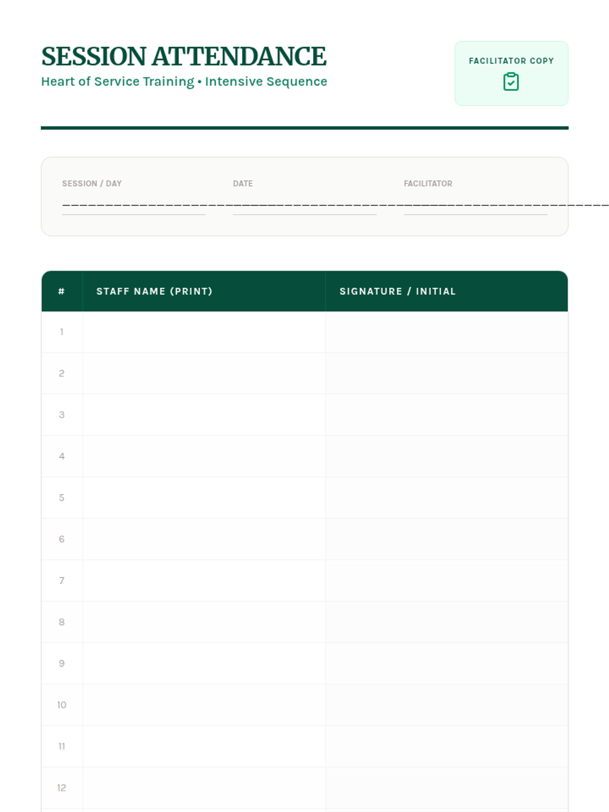 A clean, printable attendance form for the Heart of Service training. It features space for session details and a table for up to 18 staff members to sign in, matching the botanical emerald theme.
