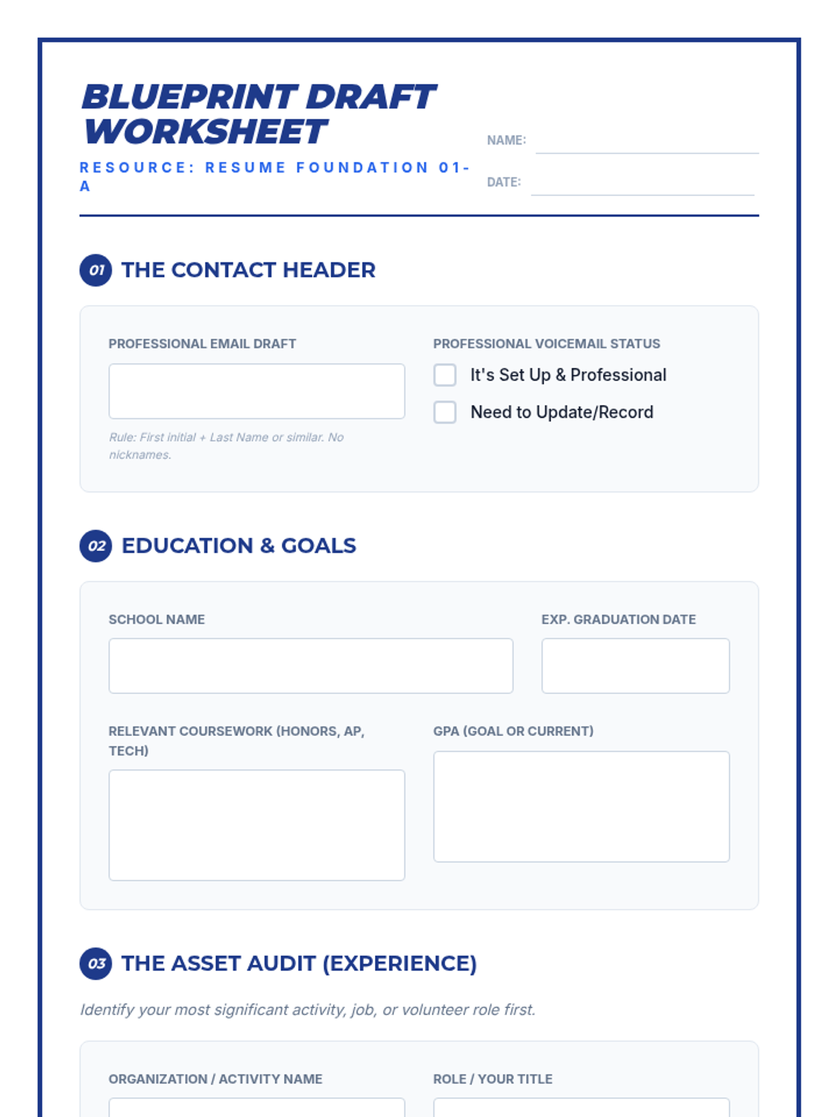 A guided brainstorming worksheet for high school freshmen to map out their first resume, including sections for professional contact info, education, and an 'asset audit' of extracurricular activities. Now expanded to two pages for better writing space.