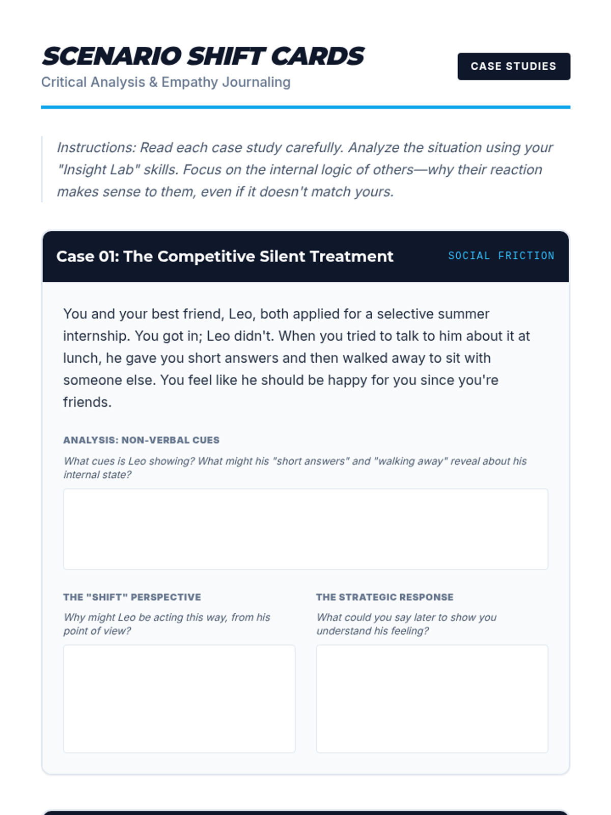 A series of four detailed social scenarios (case studies) designed for 8th-grade students to practice empathy through critical analysis. Each scenario includes prompts for decoding non-verbal cues, shifting perspectives, and drafting strategic, validating responses.