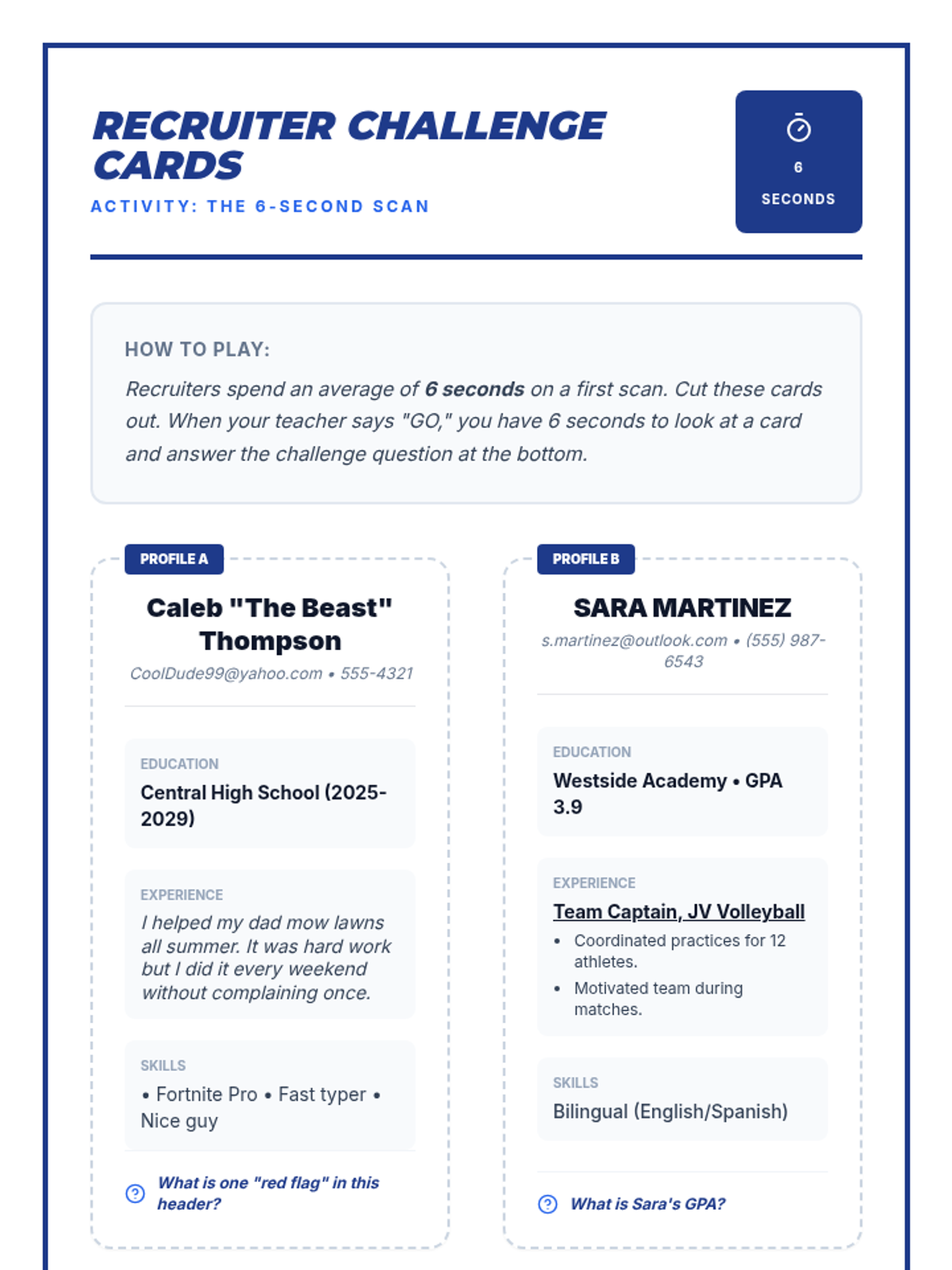 A set of four mini-resume cards used for a fast-paced '6-Second Scan' activity where students practice identifying key information and common errors in a professional format. Expanded text sizes for better print legibility.