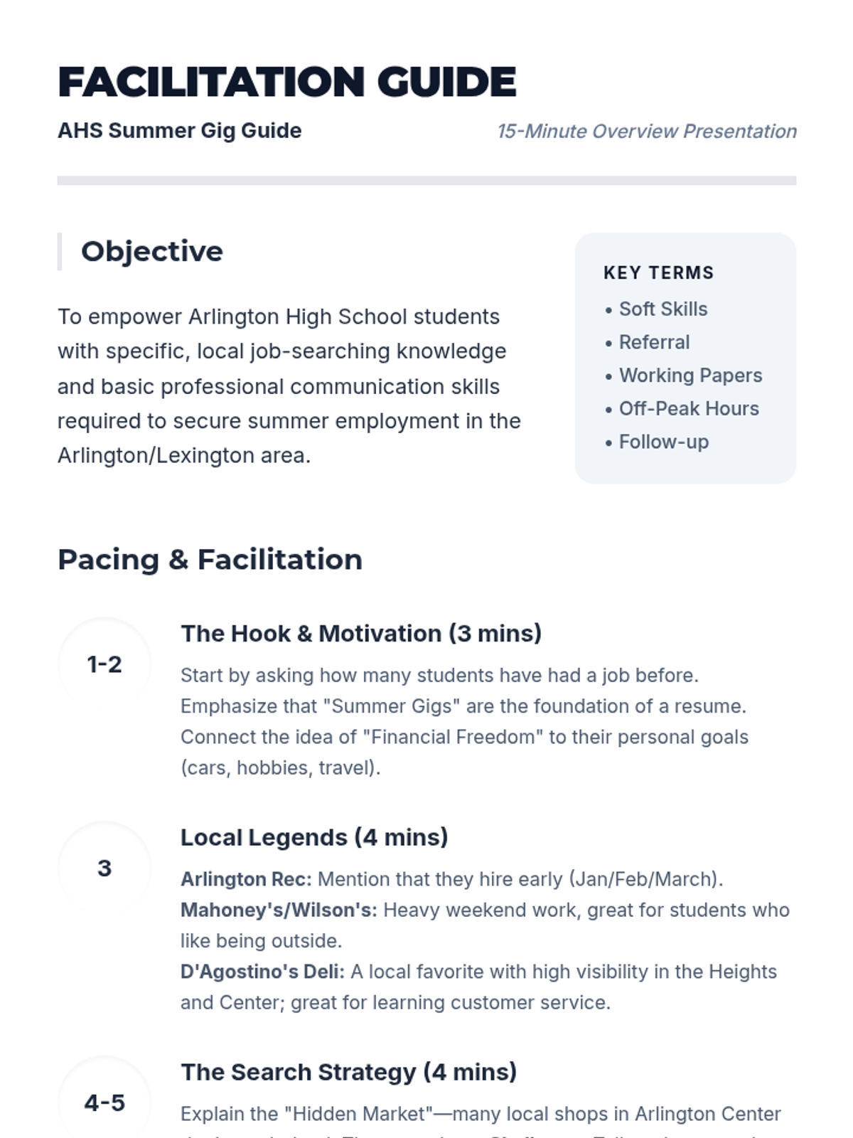A teacher-facing facilitation guide providing pacing, discussion prompts, and key insights for delivering the AHS Summer Gig presentation effectively. Updated to include D'Agostino's Deli.
