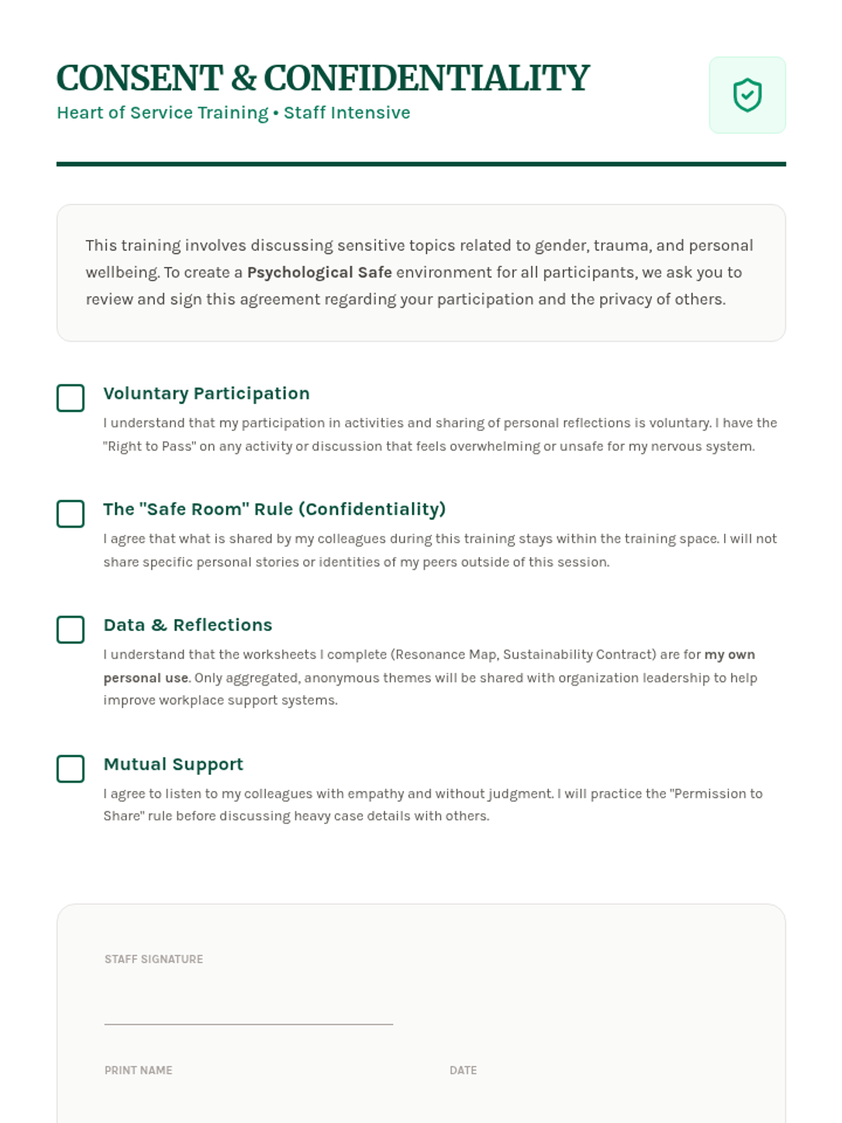 A formal participation and confidentiality consent form for the Heart of Service training. It outlines voluntary participation, the "safe room" rule for peer privacy, data handling policies, and an agreement to the group support protocols.