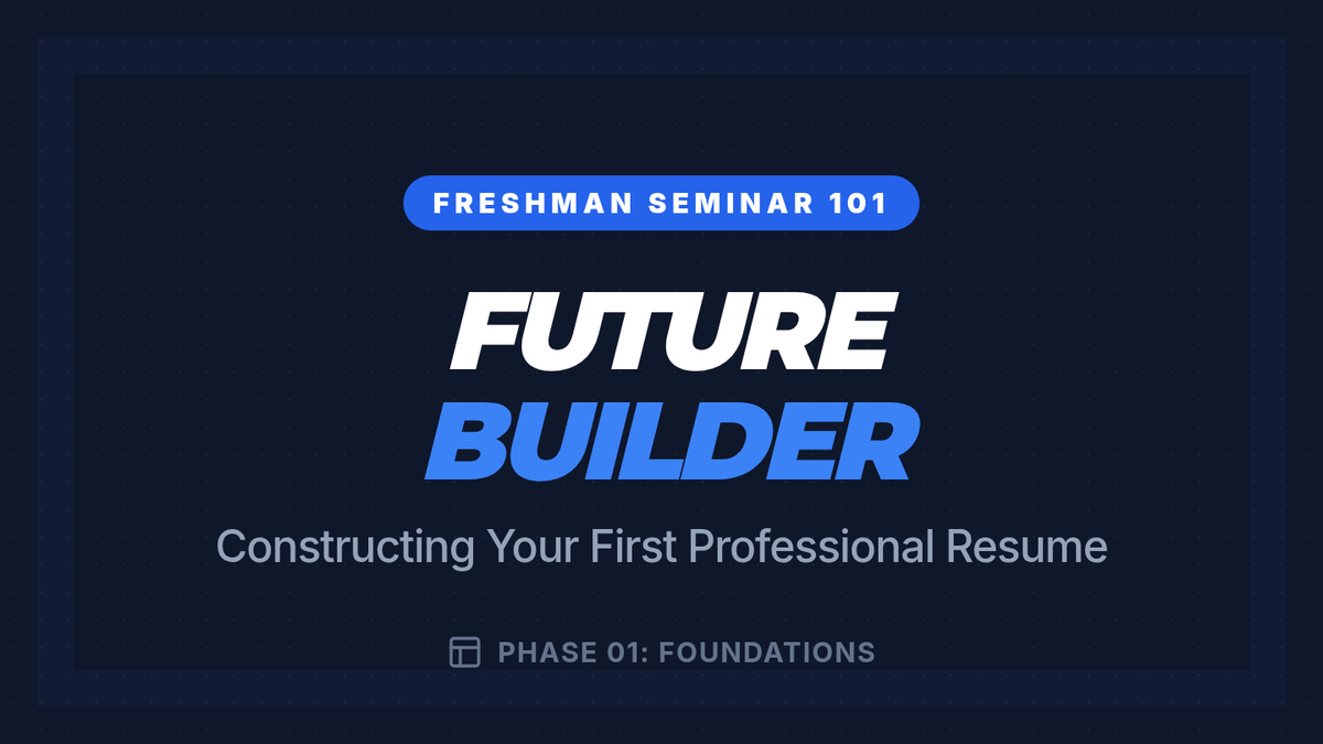 Visual presentation for the resume lesson, using a high-impact 'Future Builder' theme. Covers the five pillars of a resume, professional headers, and how to identify experience when you haven't had a formal job. Updated with larger text (minimum 24px) for presentation readability.