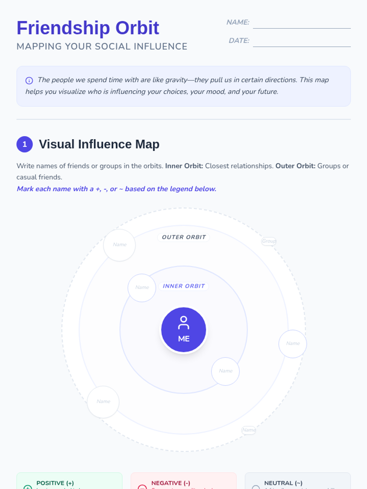 A two-page reflective worksheet titled 'Friendship Orbit' that helps students visualize and analyze the social influences in their lives. It features a circular mapping activity to categorize friends and groups into 'Inner' and 'Outer' orbits, followed by a structured table and reflection questions to evaluate positive and negative impacts.
