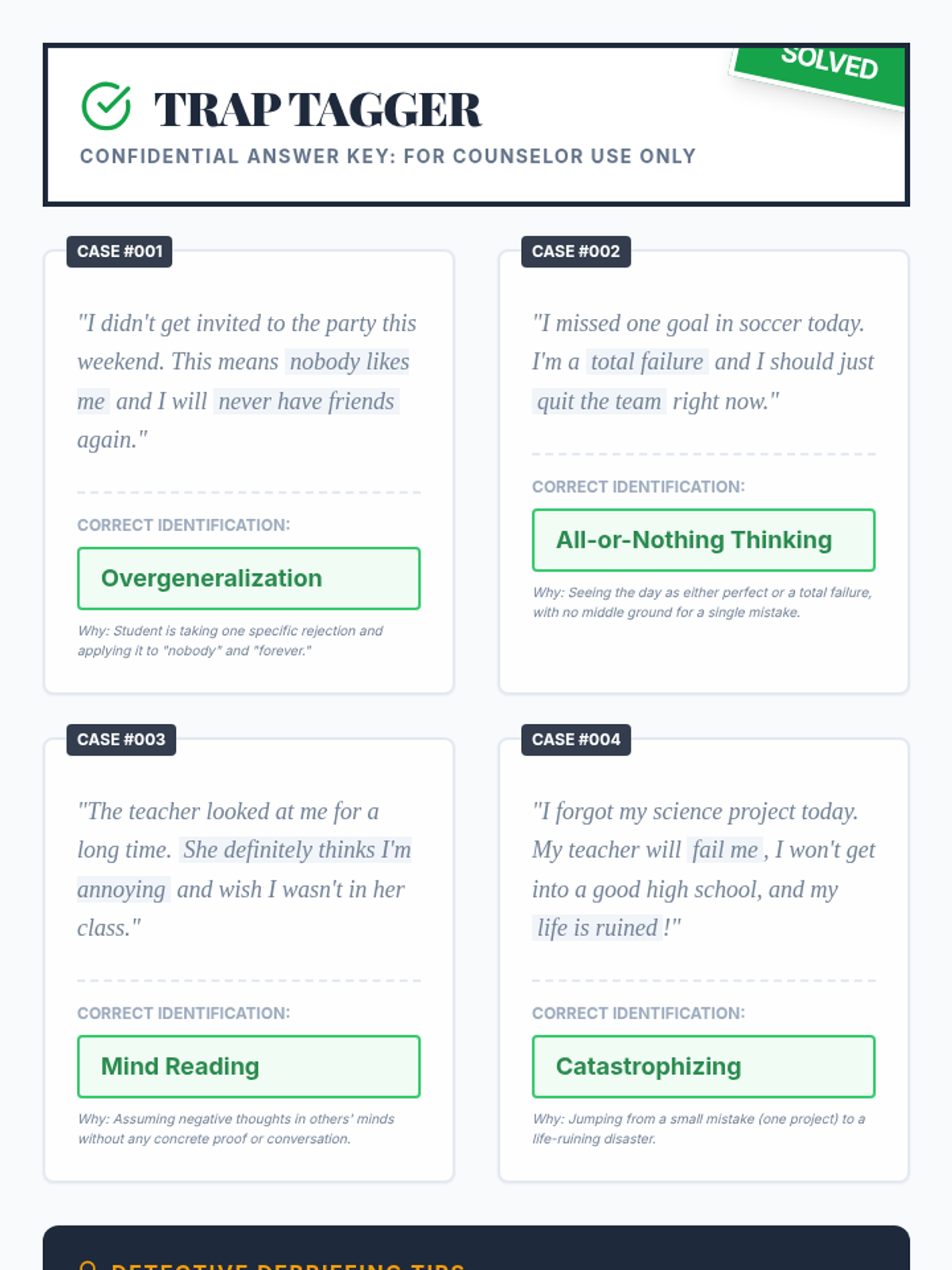Challenging Negative ThoughtsCognitive restructuring techniques and identification of common cognitive distortions. Equips learners with evidence-based questioning strategies to reframe maladaptive self-talk and promote balanced thinking.