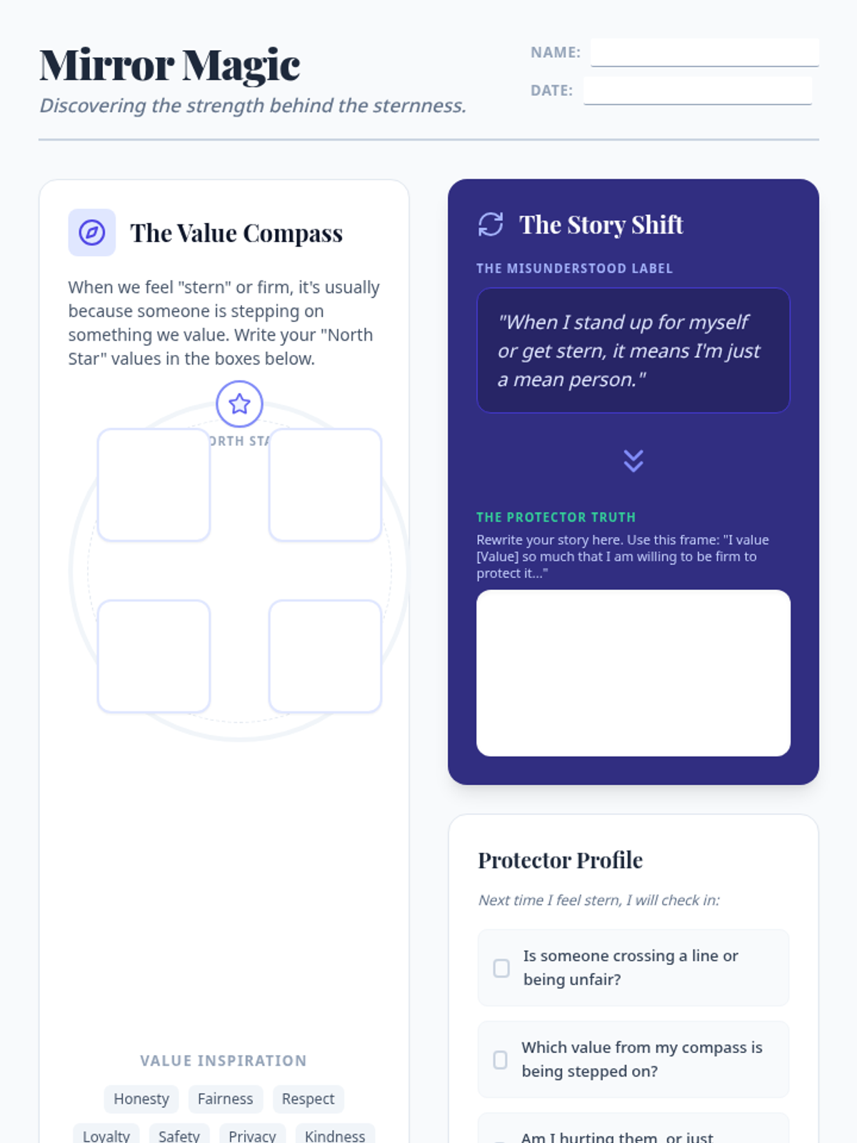 A reflective student worksheet for mapping core values and reframing 'sternness' as a protective strength.