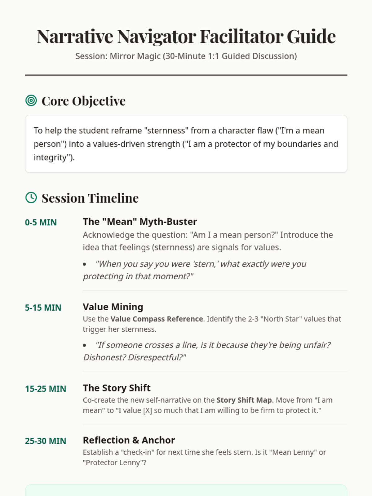 A structured 30-minute guide for teachers to lead a 1:1 discussion on reframing sternness as a values-driven strength.