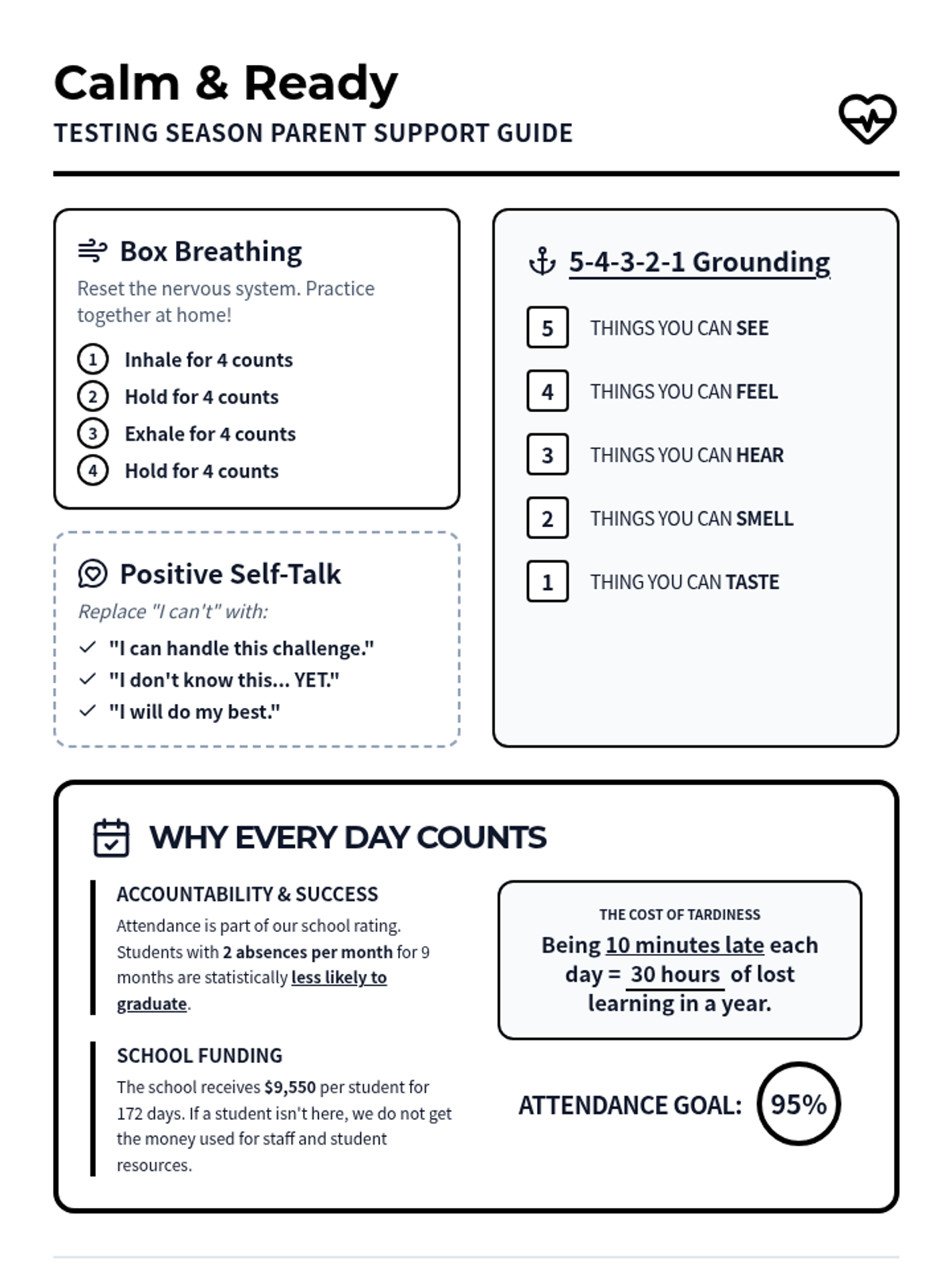 A visual infographic designed for families to help them manage housing-related anxiety. It includes grounding techniques, a "Fear vs. Truth" exercise, and a section on identifying family strengths.