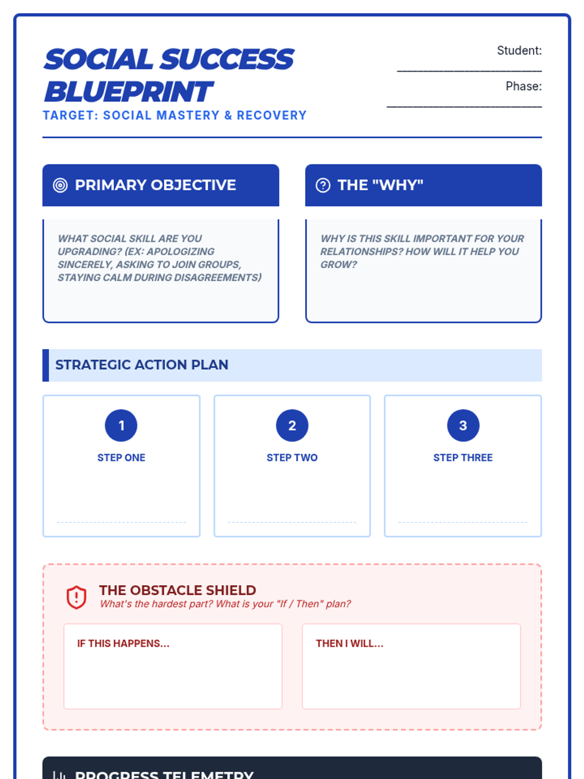 Counseling & Life SkillsSelf-AwarenessBasic Emotion RecognitionComplex Emotion IdentificationEmotional Nuance & Mixed FeelingsBuilding Positive Self-ImageRecognizing Strengths & Growth AreasAccurate Self-AssessmentPersonal Values IdentificationCultural & Individual Identity ExplorationValues-Based Decision MakingSelf-ManagementStop-and-Think StrategiesDelaying GratificationIndependent Impulse ManagementIdentifying Stress TriggersShort-Term Goal SettingSMART Goals DevelopmentGoal Monitoring & AdjustmentBuilding Perseverance & ResilienceInternal Motivation DevelopmentComprehensive Stress Reduction PlanningSocial AwarenessRecognizing Others' FeelingsDemonstrating EmpathyRespecting Individual DifferencesUnderstanding Cultural DiversityComplex Empathetic ResponsesMultiple Viewpoint ConsiderationMulti-Perspective AnalysisChallenging Stereotypes & BiasRelationship SkillsActive ListeningClear Verbal & Nonverbal CommunicationBuilding Positive FriendshipsWorking Cooperatively in GroupsCommunicating Personal BoundariesRespecting Others' BoundariesAssertive ExpressionPeaceful Problem-SolvingContributing to Team GoalsComplex Conflict NavigationMediation & NegotiationHealthy Romantic RelationshipsResponsible Decision-MakingDaily Problem IdentificationBrainstorming Multiple SolutionsEvaluating Pros & ConsRecognizing Risks & ConsequencesApplying Ethical FrameworksInformed Risk-Benefit DecisionsRoot Cause AnalysisMindfulnessMindful BreathingBody Scan MeditationDaily Mindfulness ApplicationDaily Self-Care RoutinesBalancing Life DemandsAdvocating for Wellness NeedsMental Health SupportUnderstanding Anxiety SymptomsWorry Management StrategiesProgressive Muscle RelaxationRecognizing Depression SignsBuilding Mood-Supporting RoutinesBehavioral Activation for MoodUnderstanding Grief StagesHealthy Grief CopingCreative Expression of LossBehavioral SupportDaily Check-In ProceduresDaily Goal Setting & ReviewRecognizing Escalation Warning SignsRequesting Breaks & SupportSelf-Calming During DistressUnderstanding Positive ReinforcementToken Economy ImplementationBehavior Chart TrackingAnalyzing Behavior PatternsIdentifying Antecedents & ConsequencesDetermining Behavior FunctionFunction-Based InterventionsIndividualized Behavior ContractsData-Driven Behavior AdjustmentTherapeutic ApproachesThoughts-Feelings-Behaviors ConnectionRecognizing Thinking PatternsChallenging Negative ThoughtsPositive Self-Talk PracticeThought Record TrackingAdvanced Cognitive RestructuringComprehensive CBT PlansBehavioral Activation TechniquesBuilding Positive ExperiencesExposure Hierarchies for AnxietyPresent-Moment AwarenessNon-Judgmental ObservationSelf-Soothing & DistractionComplex Emotion LabelingReducing Emotional Vulnerability (PLEASE)DEAR MAN CommunicationGIVE Skills for RelationshipsFAST Skills for Self-RespectRadical Acceptance PracticeCrisis Survival Skills (TIPP)Understanding Trauma EffectsTrauma Responses & TriggersIdentifying Trauma FeelingsGrounding TechniquesRegulation During Trauma DistressSafe Place VisualizationProcessing Through NarrativeDeveloping Trauma StoryPersonalized Safety PlanningGroup SupportTurn-Taking & SharingGroup Conversation SkillsSharing in Supportive EnvironmentLearning from Similar ChallengesBuilding Community & BelongingNavigating Peer RelationshipsGroup Skill PracticeGroup Mental Health EducationStress & Anxiety UnderstandingCrisis Support & SafetyKnowing When to Seek HelpIdentifying Mental Health CrisesGrounding During CrisisUsing Crisis HotlinesBuilding Support NetworksAccessing Mental Health ResourcesWarning Signs & Coping StrategiesDeveloping Personal Safety PlansUnderstanding Suicide Warning SignsGatekeeper Skills for PeersDigital LiteracySocial MediaTechnology BasicsProductivity ToolsInternet and Online ResearchWeb Design and PublishingDigital CitizenshipOnline Safety and PrivacyEmerging TechnologiesFinancial LiteracyMaking Financial DecisionsBanking and AccountsConsumer SkillsSaving and InvestingCredit and DebtEmployment and IncomeTaxesInsuranceMajor PurchasesEconomic ConceptsFinancial PlanningCollege & Post-Secondary PlanningCareer ExplorationUnderstanding Post-Secondary OptionsCollege Research & SelectionAdmission RequirementsCollege Application ProcessPersonal Statement WritingFAFSA CompletionScholarship Search & ApplicationsUnderstanding Student LoansContinuing Education PlanningInterview PreparationResearching EmployersCommon Interview QuestionsSTAR Method ResponsesProfessional Interview PresenceVirtual Interview SkillsInterview Follow-UpJob Search SkillsUnderstanding Job PostingsEffective Job Search StrategiesNetworking for OpportunitiesResume Writing BasicsAction Verbs & AchievementsTailoring Resumes to JobsCover Letter WritingProfessional ReferencesProfessional CommunicationBusiness Email EtiquettePhone & Voicemail ProfessionalismMeeting ParticipationPresentation SkillsProfessional Work EthicTime Management & ProductivityTeamwork & CollaborationAdaptability & FlexibilityProblem-Solving at WorkConstructive FeedbackWorkplace RightsUnderstanding Employment LawsPay & Benefits UnderstandingWorkplace SafetyAnti-Discrimination & Harassment