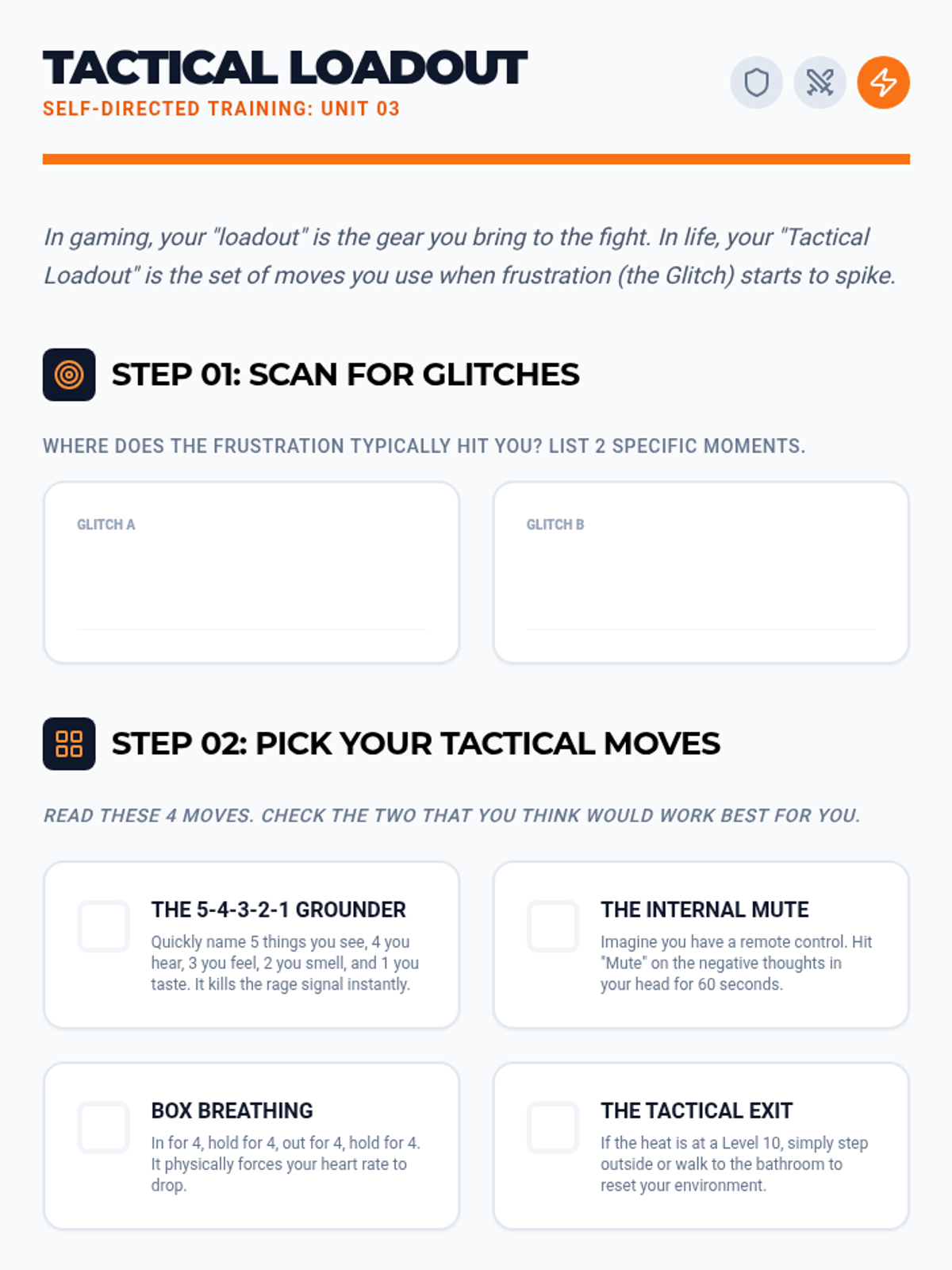 Self-Soothing & DistractionSensory-based grounding techniques and distress tolerance strategies for immediate emotional regulation. Equips individuals with mindfulness practices and constructive diversions to manage intense psychological triggers.