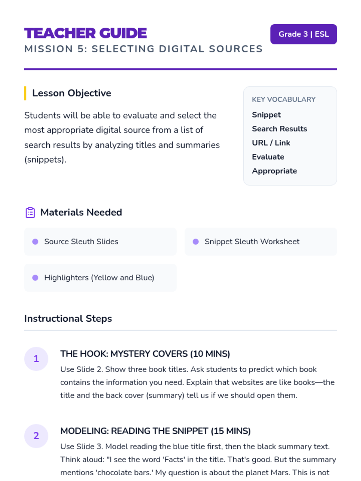 Teacher's guide for Lesson 5, focusing on evaluation of digital search snippets and teaching students to use titles and summaries as evidence for source selection.