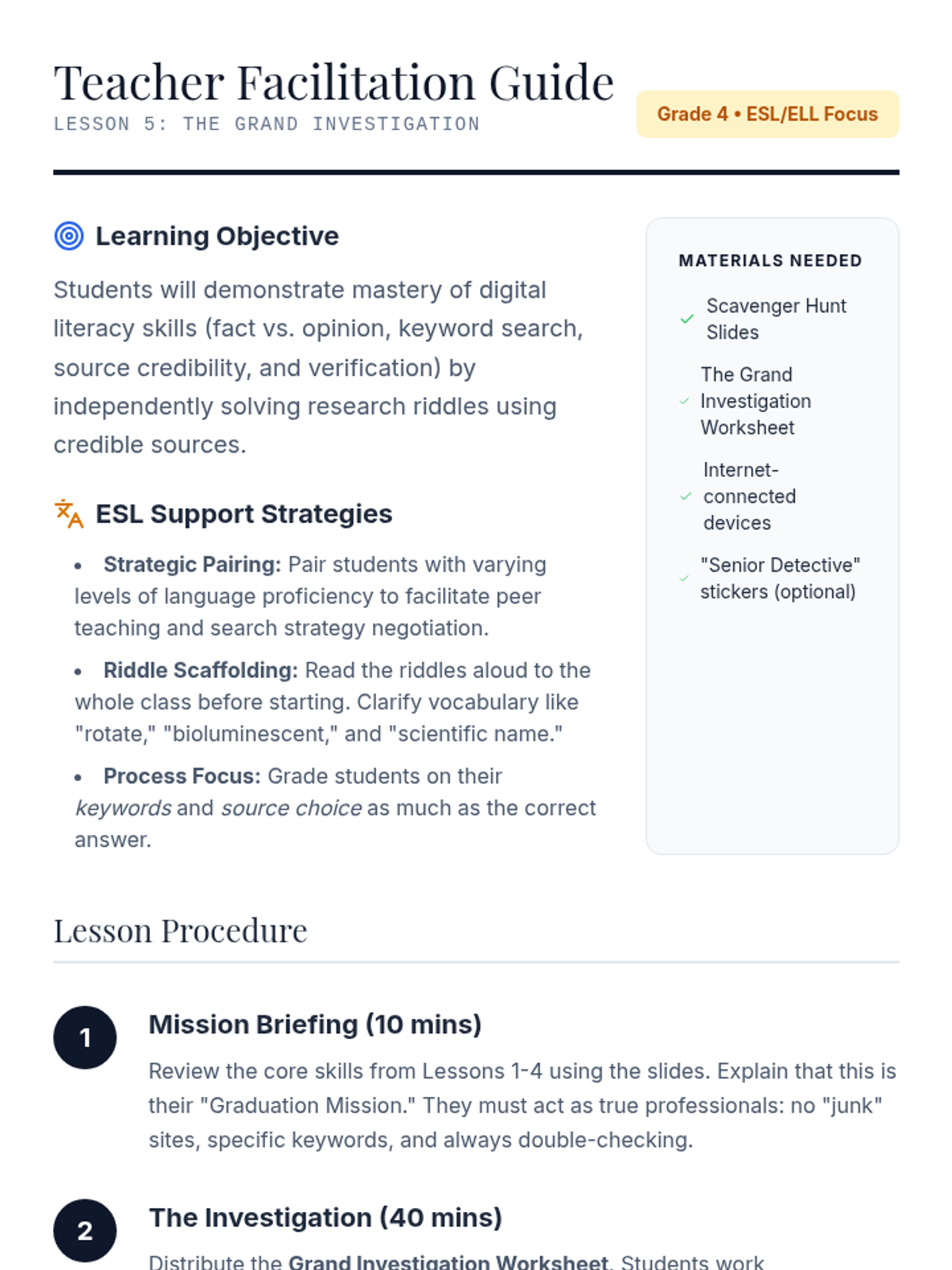 Teacher facilitation guide for the final "Grand Investigation" mission. Includes lesson timing, pairing strategies, and a detailed answer key for the scavenger hunt riddles.
