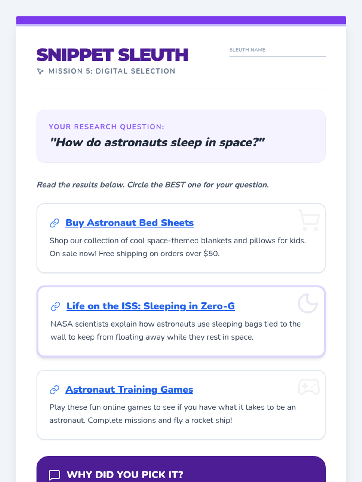 Student worksheet for Lesson 5, featuring simulated search results (snippets) that students must evaluate to choose the most appropriate source for a research question about astronauts.