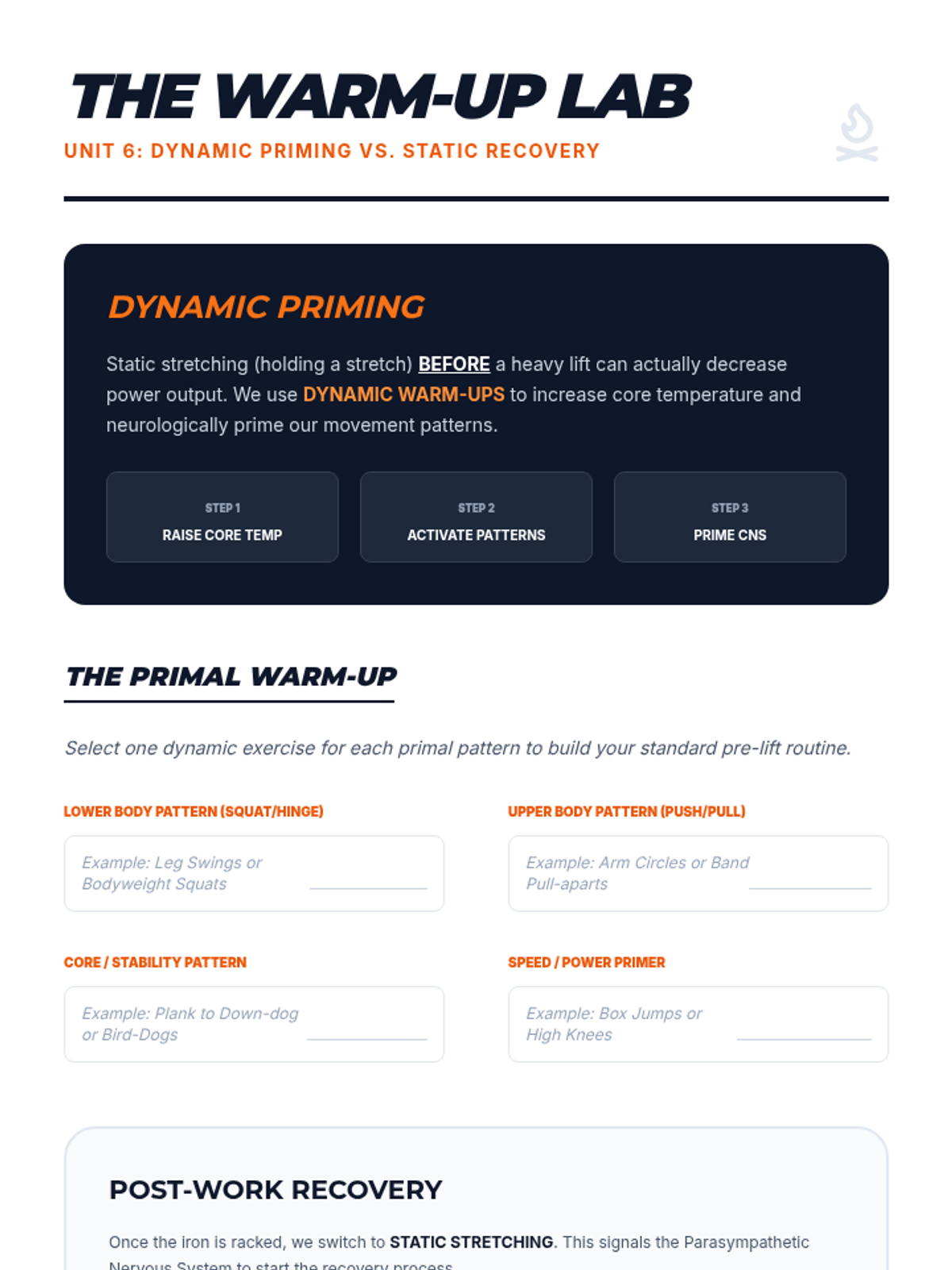 A classroom activity worksheet for building dynamic warm-up routines and understanding the physiological differences between pre-workout priming and post-workout static recovery.