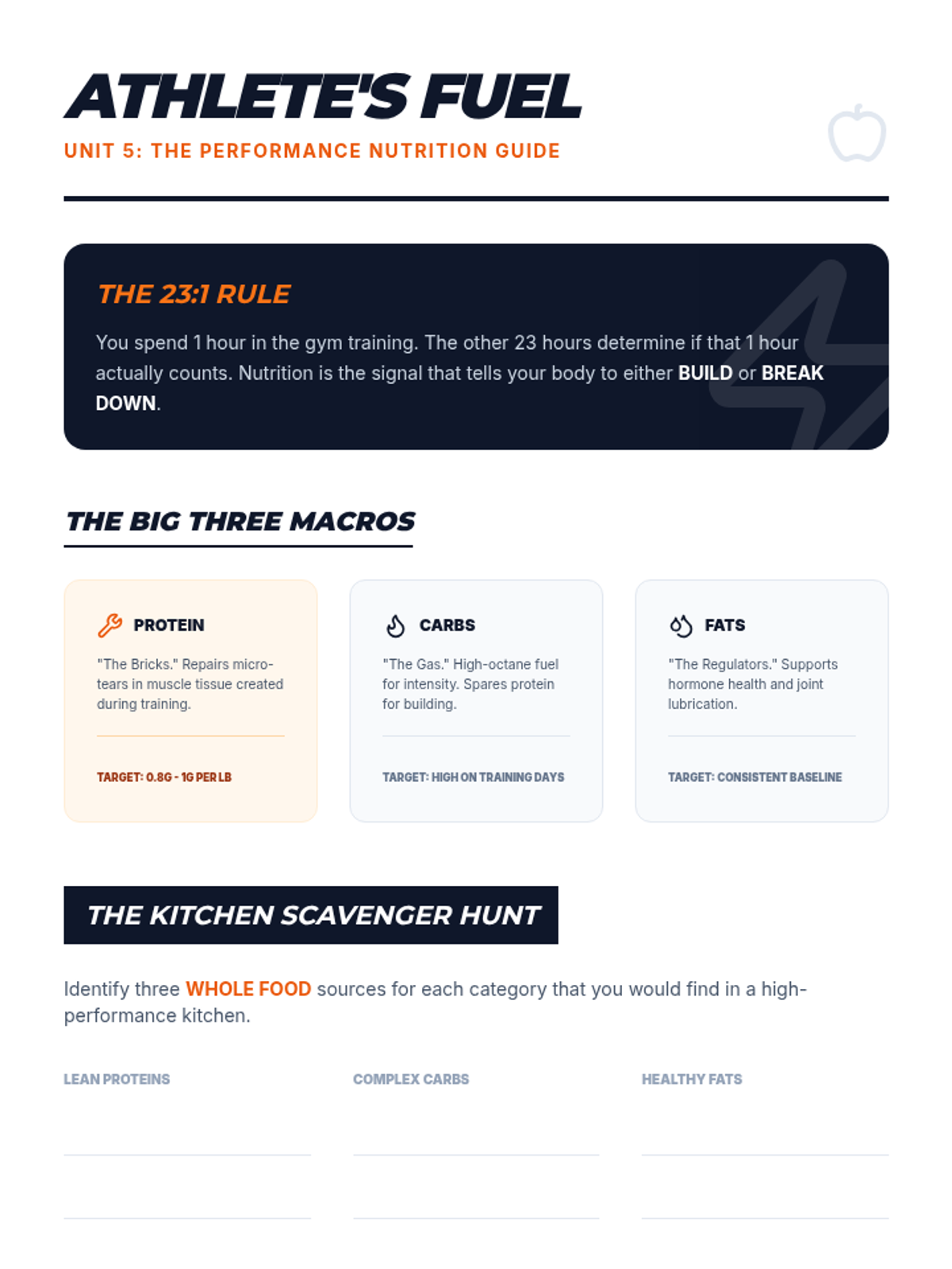 A student fueling guide and kitchen scavenger hunt worksheet, detailing macronutrient roles and calculating individualized hydration targets for athletes.