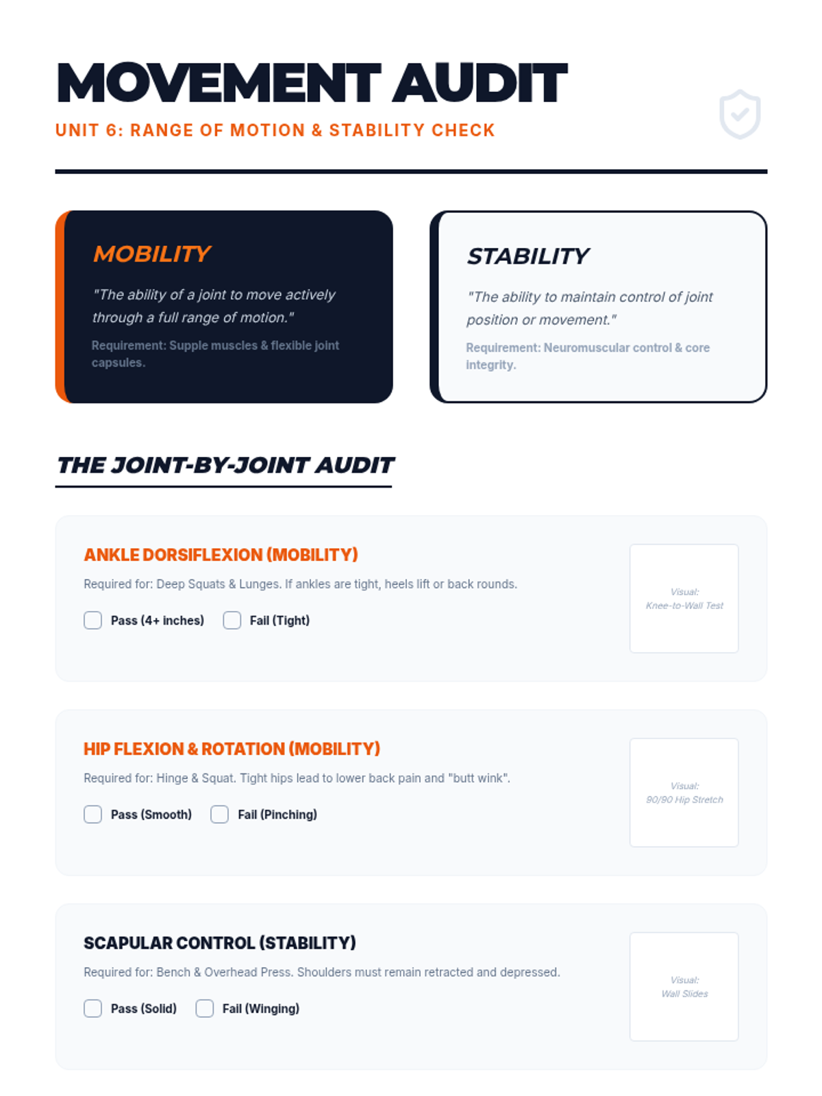 A student movement audit and joint-by-joint checklist to assess mobility and stability requirements for major lifts, including a corrective exercise tracking section.