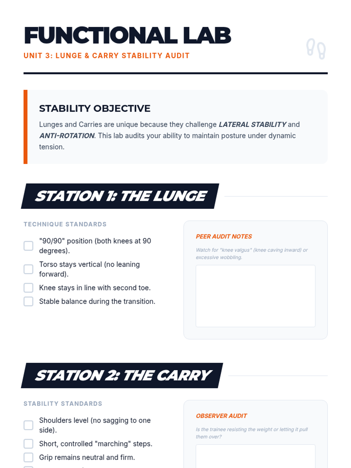 A practical movement lab report for peer-observed audits of the Lunge and Carry patterns, focusing on postural integrity, balance, and anti-rotational stability.