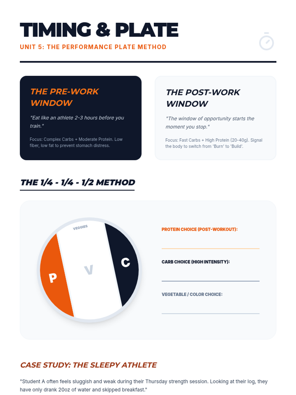 A classroom activity worksheet on nutrient timing and the Performance Plate method, featuring a case study analysis and meal builder section.