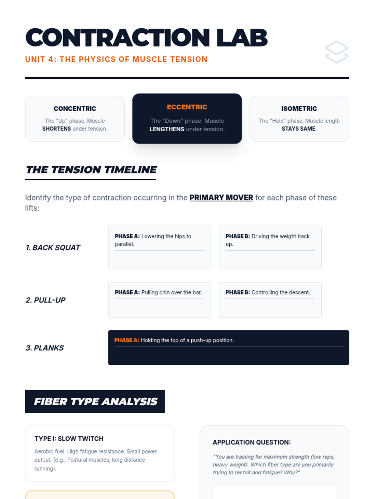 A classroom activity worksheet for identifying muscle contraction types (concentric, eccentric, isometric) in gym movements and analyzing the recruitment of different muscle fiber types.