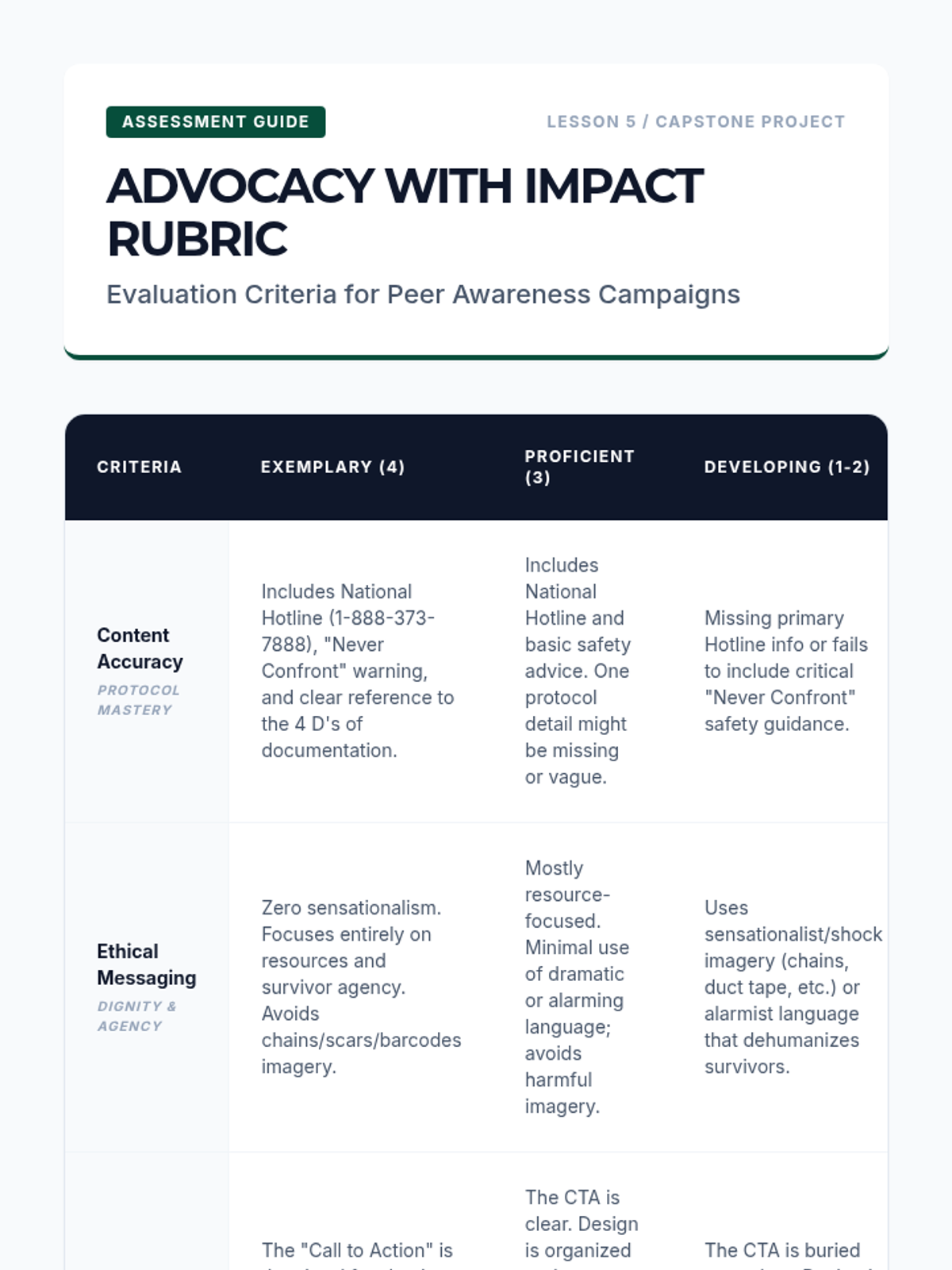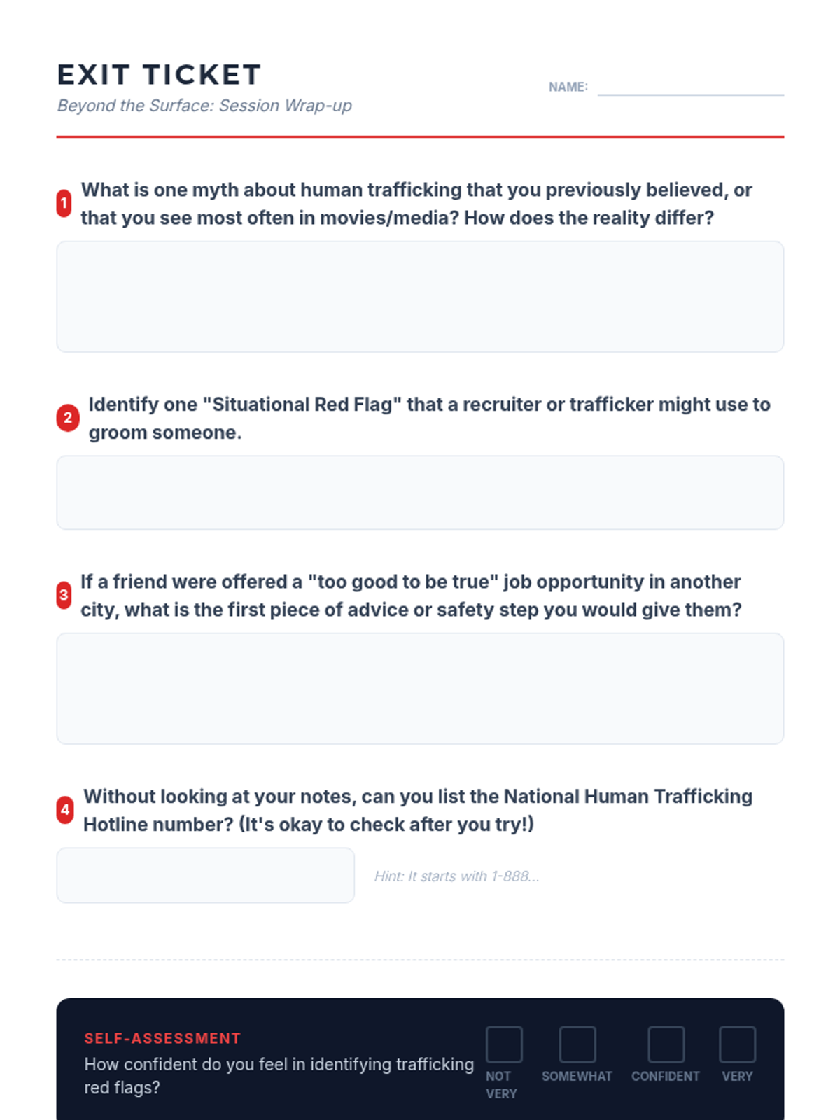Personal boundaries, emergency response protocols, and digital security measures for physical and online environments. Equips students to recognize unsafe situations, navigate conflict, and understand risks associated with trafficking, fire, and water safety.