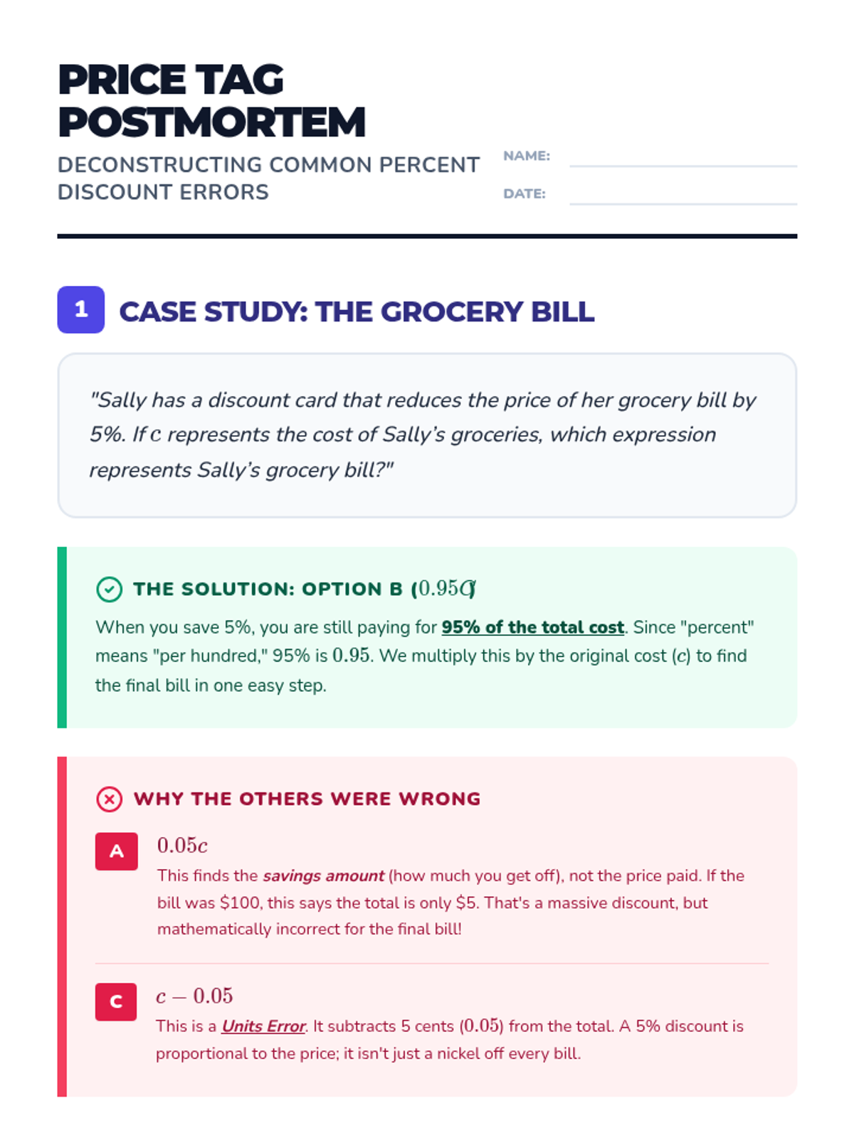 Week 4 workbook covering practical consumer math like sales tax, discounts, tips, and unit pricing through real-world scenarios. Adjusted to prevent content overlap.