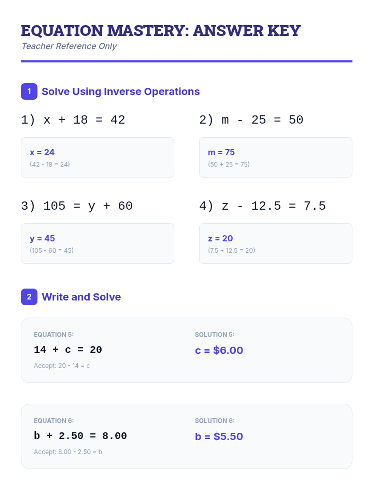 Equation Solving and ReasoningAlgebraic manipulation, inverse operations, and logical justifications for solving linear and multi-step equations. Develops the ability to verify solutions and communicate mathematical steps clearly.