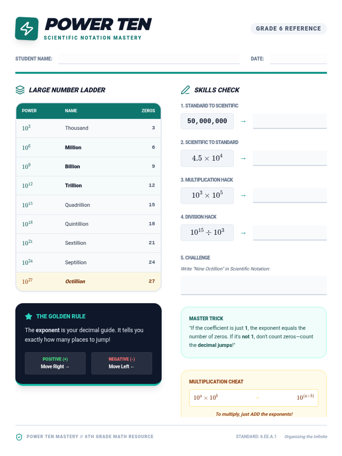A visual anchor chart illustrating the concept of magnitude using powers of 10. It features a scale ladder ranging from atomic levels to cosmic distances with clear examples and visual benchmarks.