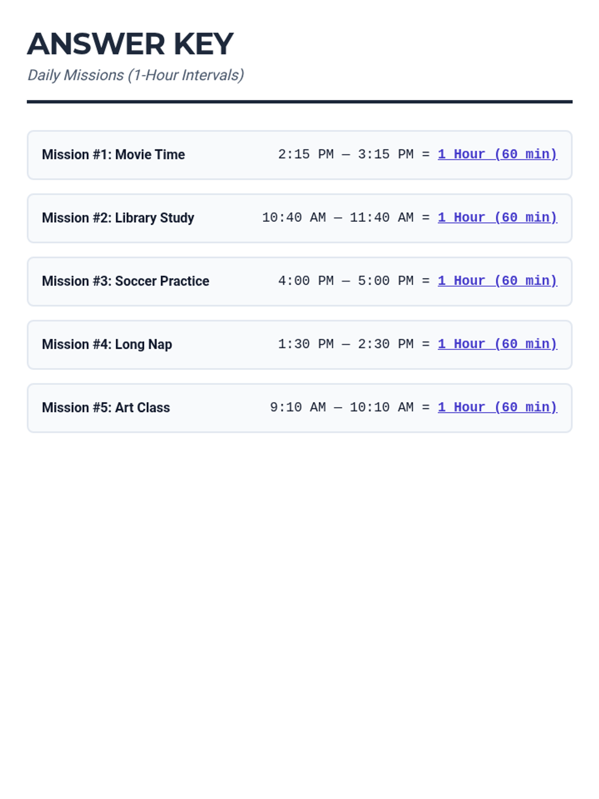 The answer key for the Daily Missions Worksheet, providing start times, end times, and calculated elapsed time for each scenario.