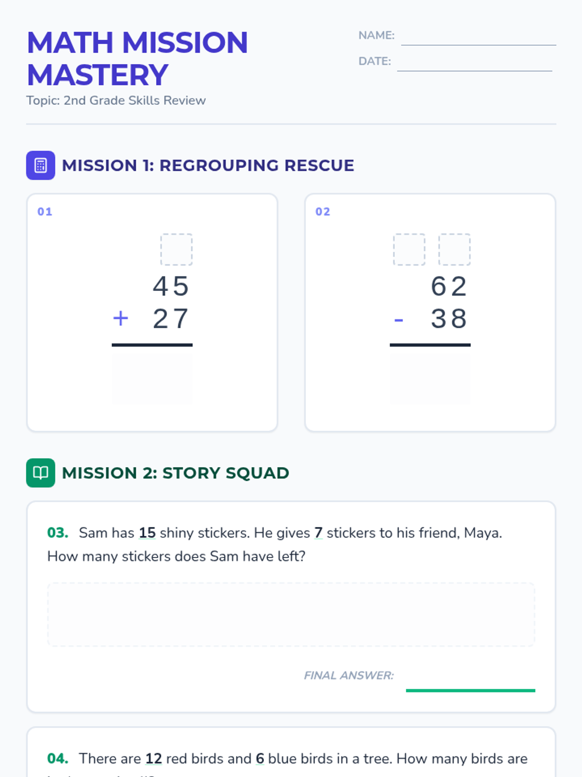 A polished 10-question math review worksheet for 2nd-grade Tier 2 intervention, featuring realistic-looking clocks and coins to enhance engagement and conceptual understanding.