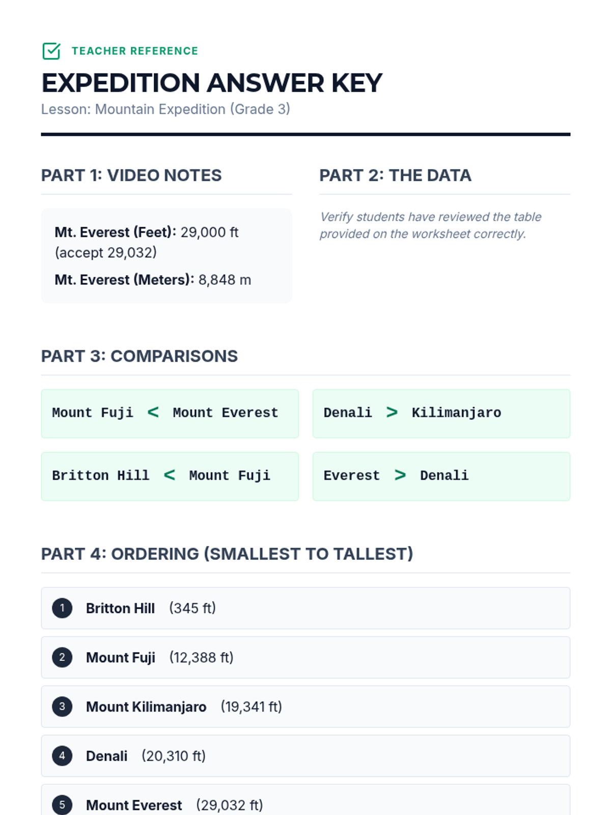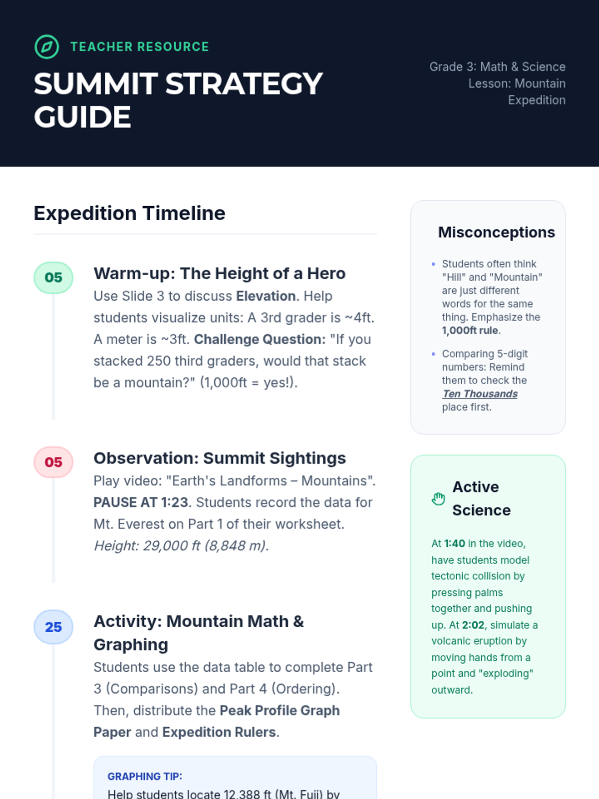 A comprehensive teacher facilitation guide for the Mountain Expedition lesson, including a lesson flow timeline, discussion anchors, and teacher tips.
