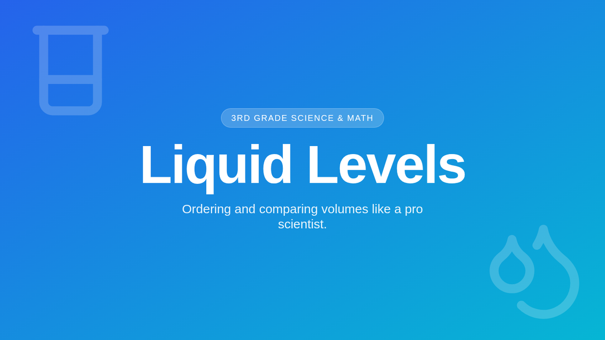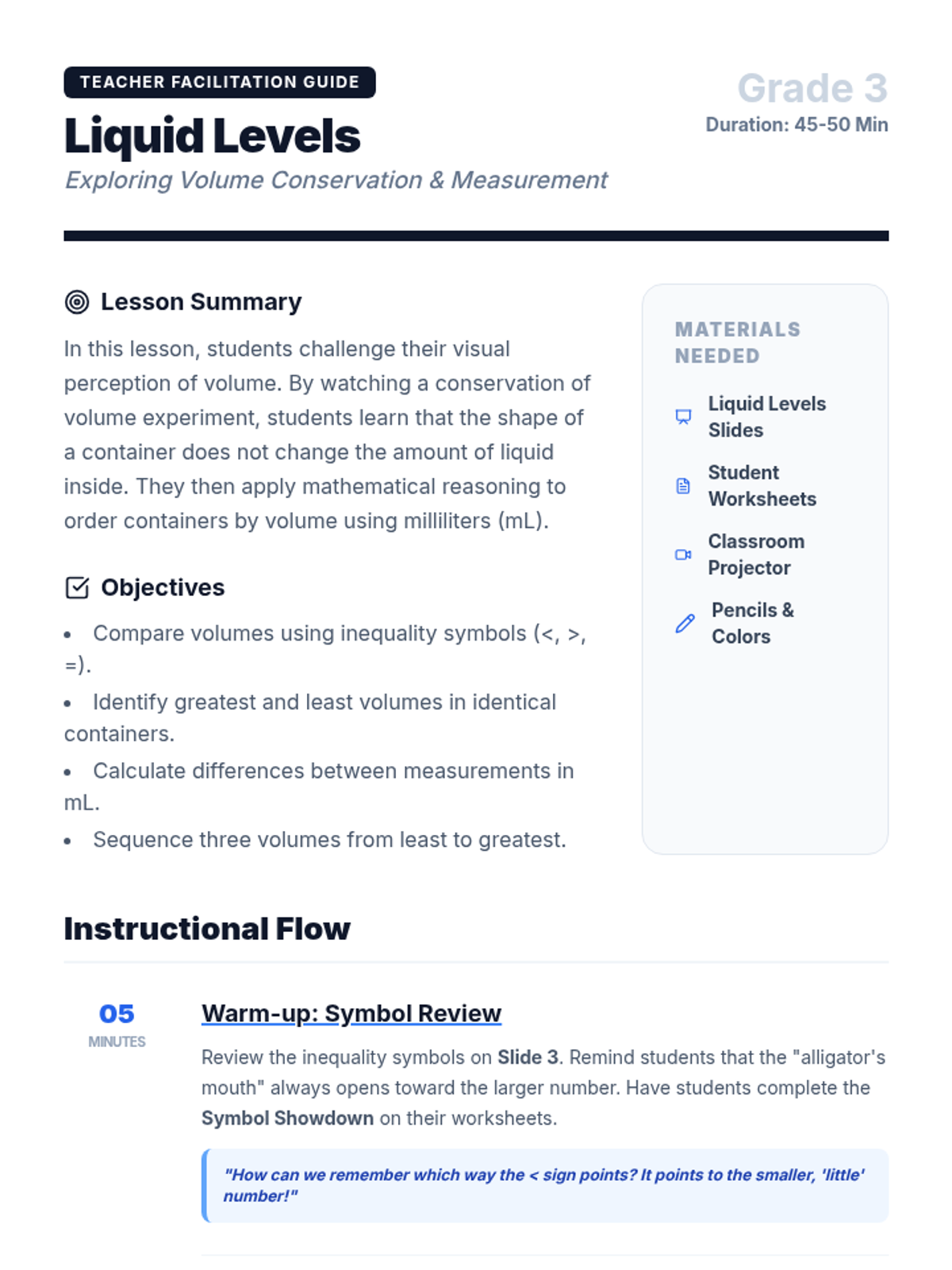 Interactive slide deck for the 'Liquid Levels' lesson, covering volume comparisons, inequality symbols, a video experiment, and the concept of displacement. Features large, readable text and clear visual aids for 3rd-grade students.
