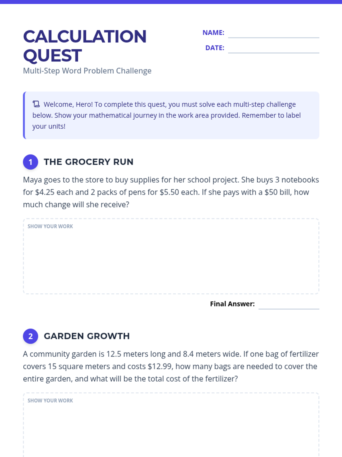 Detailed step-by-step answer key for the Calculation Quest Worksheet, showing all calculation steps for each multi-step word problem.