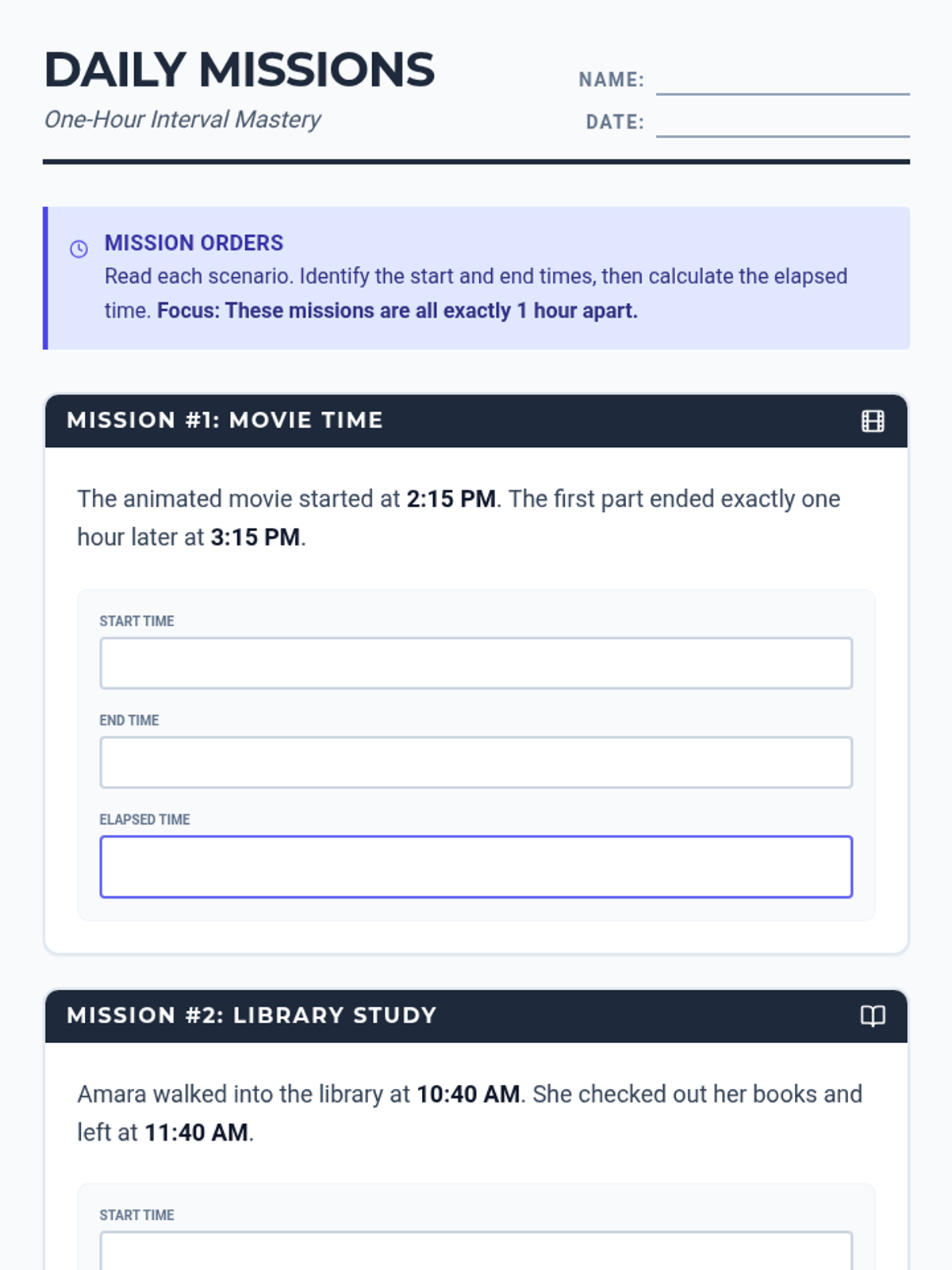 A scenario-based worksheet where students identify start and end times and calculate elapsed time, specifically focusing on exactly one-hour intervals.