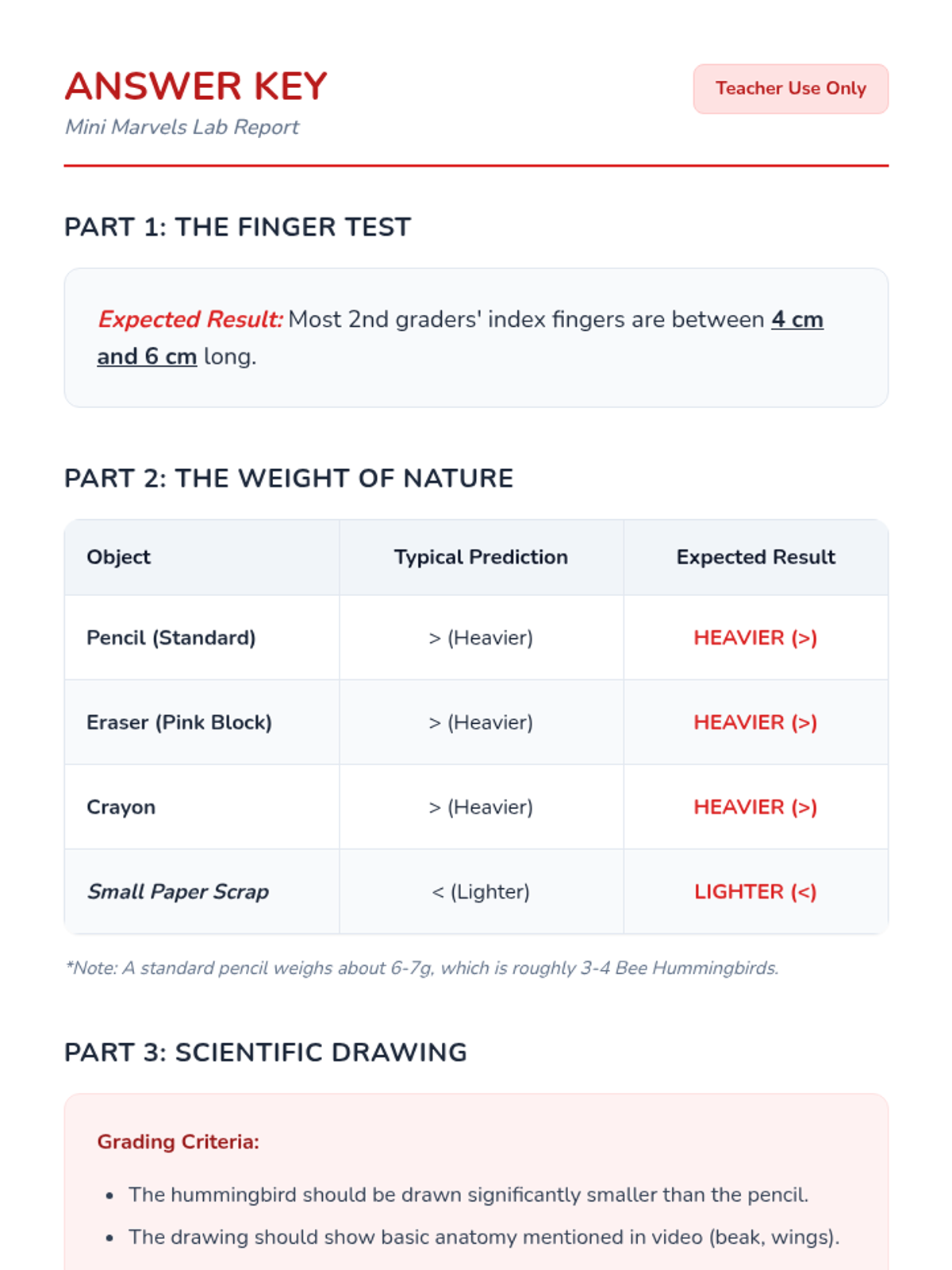An answer key for the Hummingbird Lab Worksheet, providing expected results for measurements and weight comparisons to help teachers grade student work.