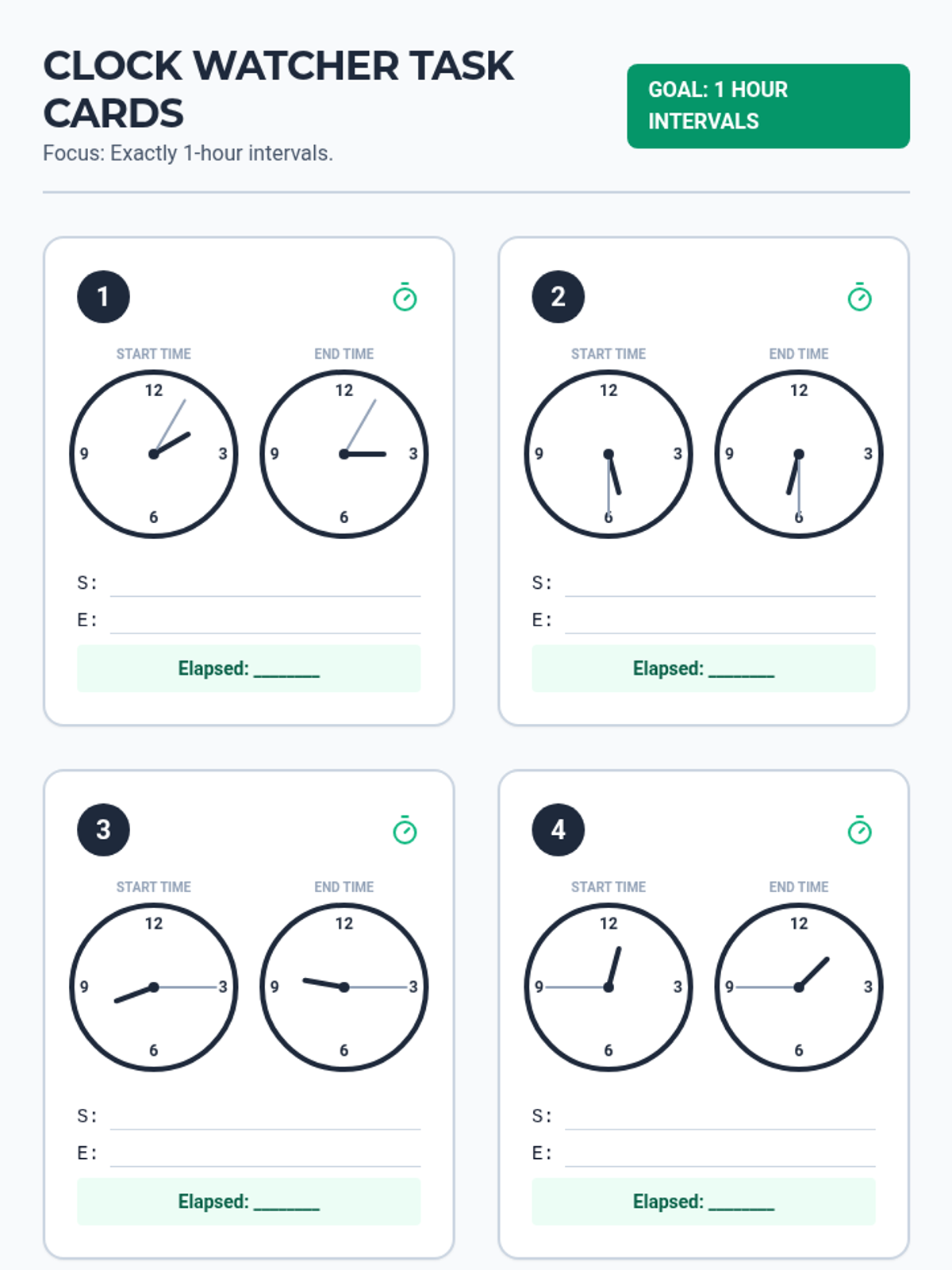 A set of 8 task cards featuring analog clocks showing start and end times exactly one hour apart. Students identify times and verify the 60-minute interval.