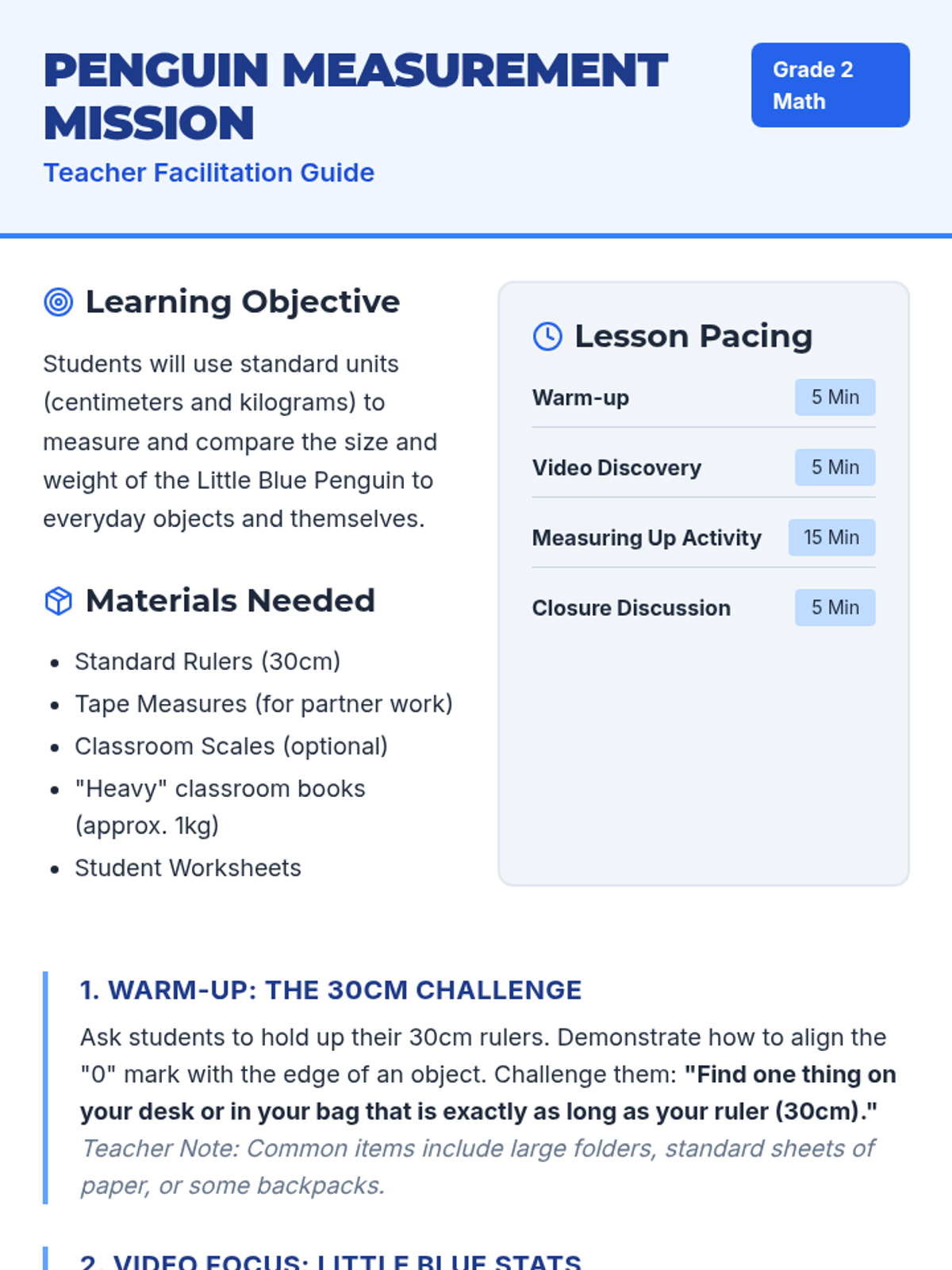 A comprehensive teacher guide for the Penguin Measurement Mission lesson, featuring learning objectives, materials lists, a detailed lesson plan with pacing, and differentiation strategies.