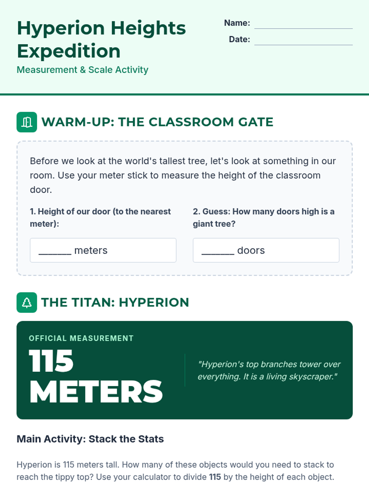 A student worksheet for the 'How High is Hyperion' lesson. Includes a warm-up measurement task, a calculation table for comparing 115 meters to various objects, and a space for poster planning.