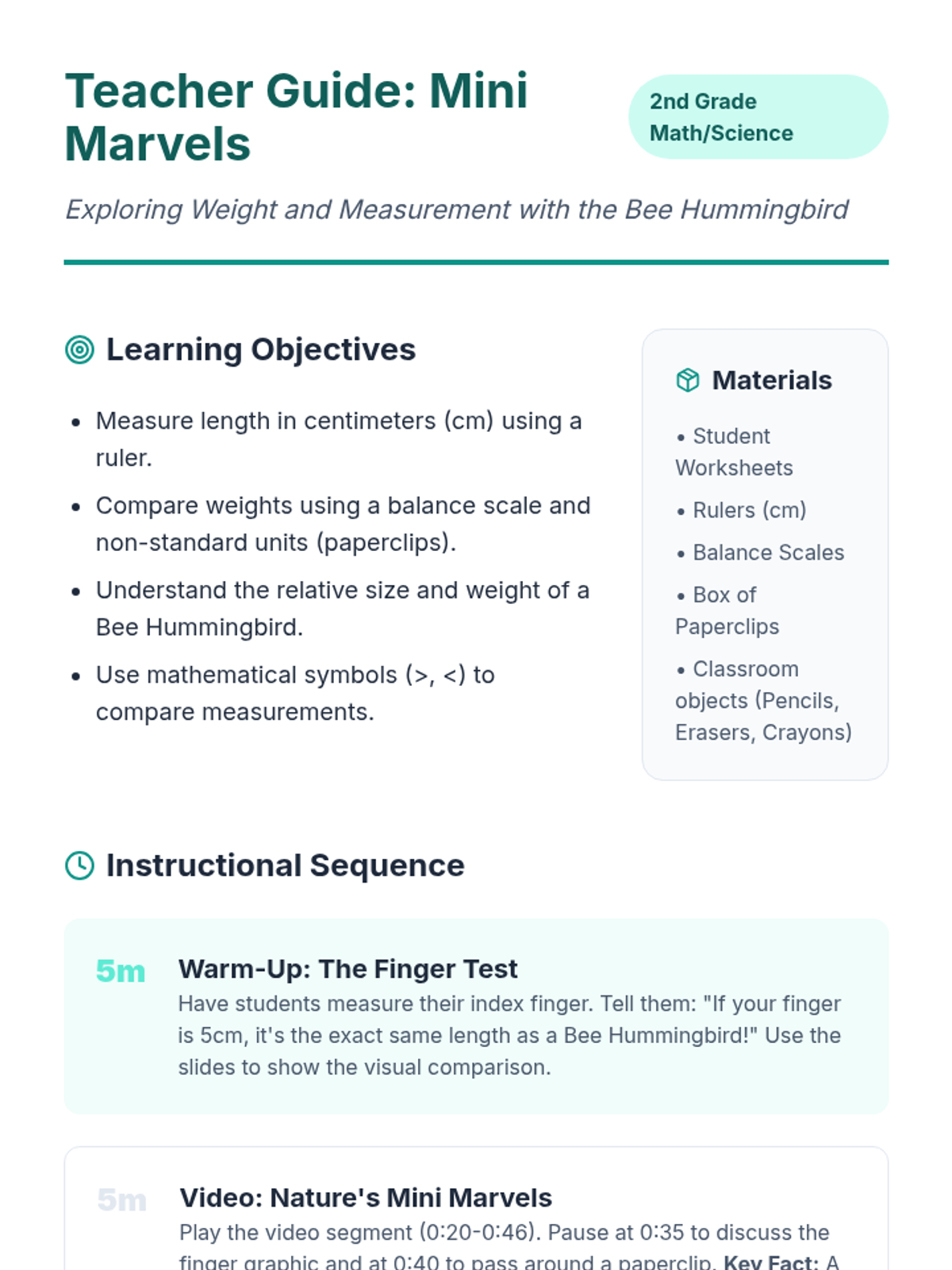 A slide deck to guide students through a measurement lesson on Bee Hummingbirds, including a warm-up finger measurement, an embedded video segment, and instructions for a weight comparison lab.