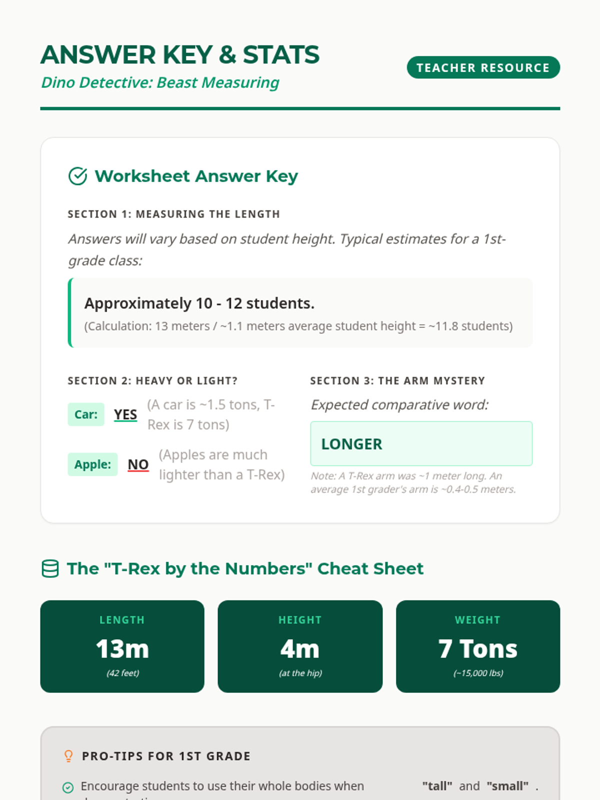 An answer key and quick-reference sheet for teachers, providing exact T-Rex statistics and expected student responses for the Beast Measuring Worksheet.