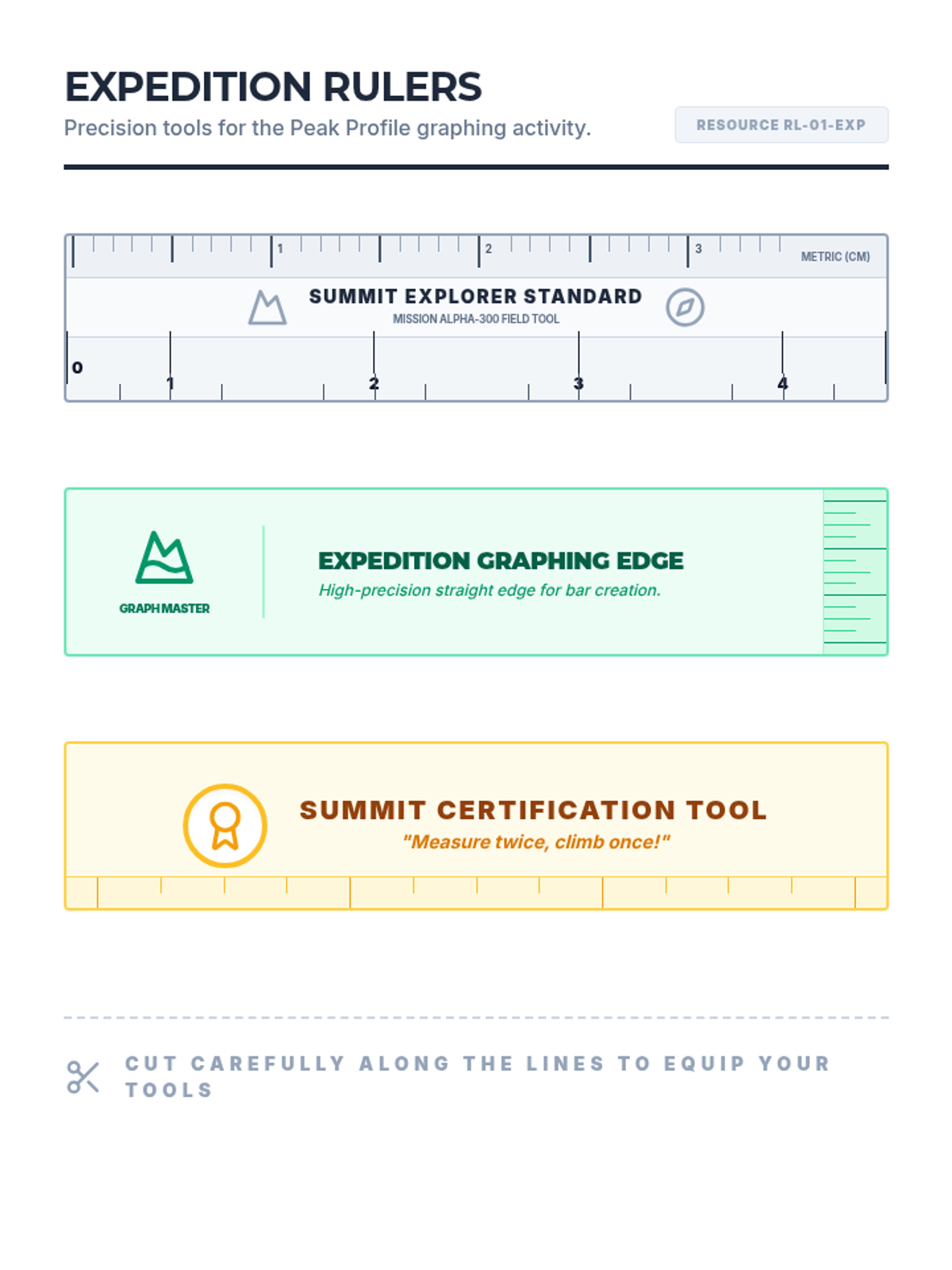 A printable sheet containing three themed rulers (inch and cm) for students to use in mountain graphing and elevation activities.