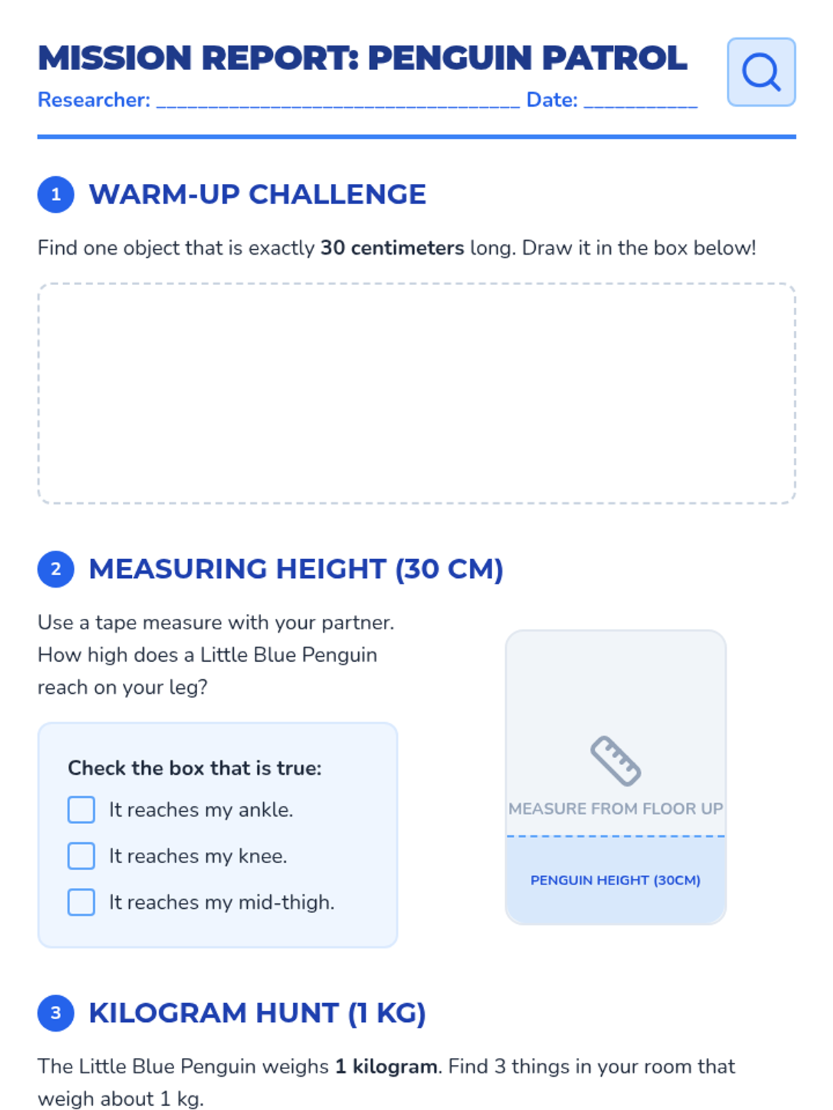A student worksheet for the Penguin Measurement Mission lesson, featuring a warm-up drawing area, a height comparison activity using 30cm, a weight hunt for 1kg objects, and a final reflection question.